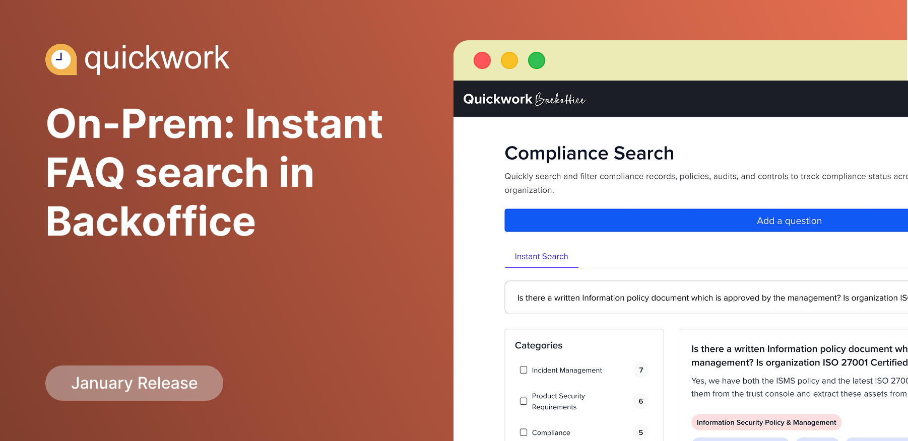 The Quickwork Backoffice now enables instant access to answers for frequently asked questions related to product usage, compliance, security, and more. Users can search via keywords or interact using a RAG-powered chat interface. Authorized users can add new FAQs with tags and categories, while embeddings are automatically generated to ensure accurate and fast retrieval.