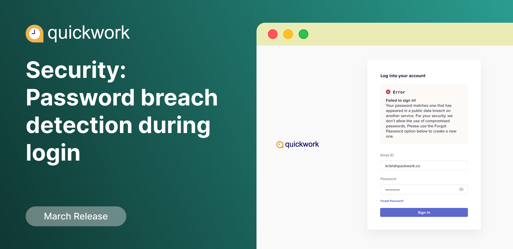 Quickwork now prevents users from logging in with passwords that have appeared in publicly disclosed data breaches. The system securely generates a SHA-1 hash of the password and checks only the first five characters against known breach datasets. The remaining hash verification is performed locally. This approach helps prevent unauthorized access using compromised credentials while preserving password privacy. Users can regain access by resetting their password to a stronger one.
