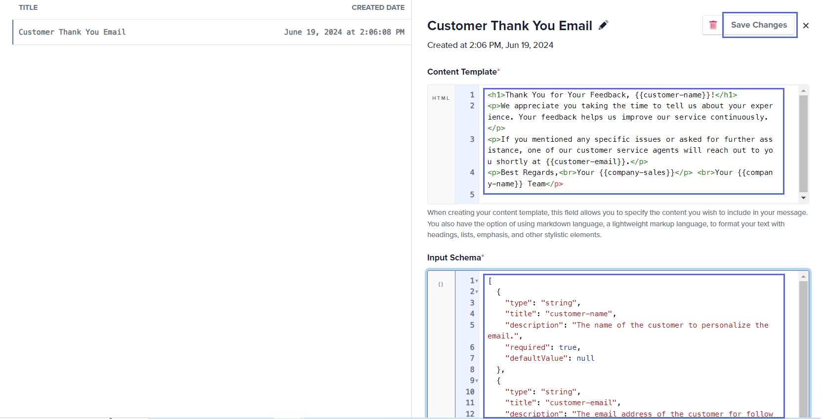 - To proceed, fill in the Content Template field: The Content Template is where you specify the structure and content of your message, incorporating dynamic placeholders like {{customer-name}} and {{customer-email}} for personalized communication.