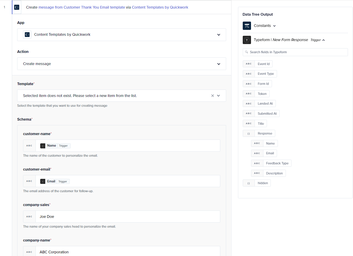 - Ensure that the Schema like customer-name, customer-email, and company-sales (from Input Schema in Content Templates) are correctly mapped from the Typeform trigger in the Data Tree Output.