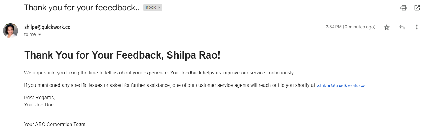 Consider a scenario where an e-commerce business aims to automate the process of sending personalized thank-you emails to customers after they submit feedback. Using Quickwork's Content Templates, the business can efficiently create a dynamic email template that incorporates customer-specific data like name, email pulled directly from feedback forms submitted via Typeform. This automation ensures that every customer receives a tailored thank-you note from the company sales head, enhancing customer engagement and satisfaction while streamlining response management.