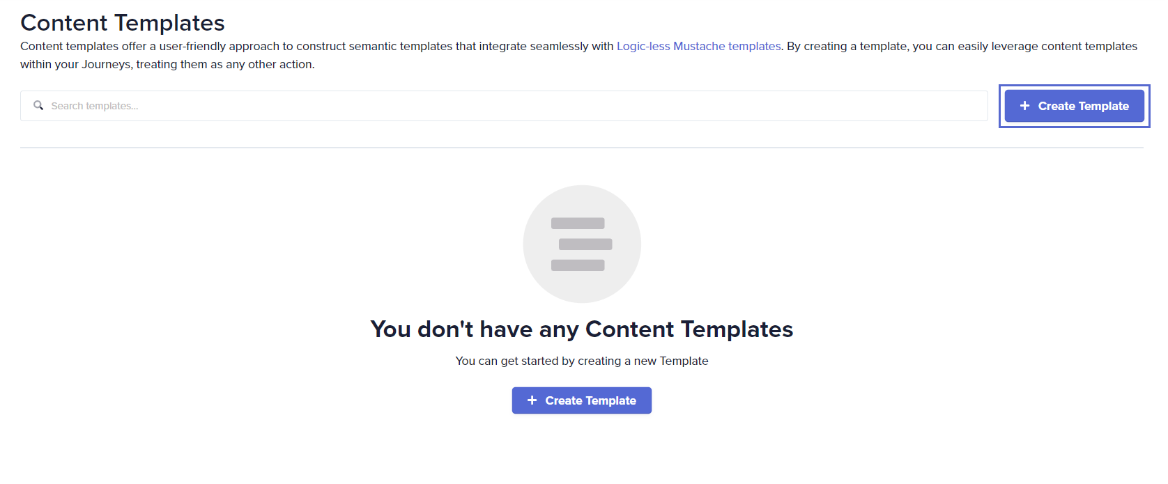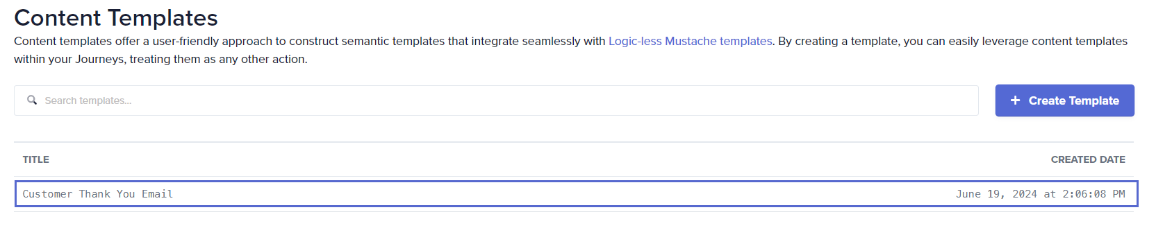 Content templates provide a structured way to create and use consistent content in your journeys, seamlessly integrating with Logic-less Mustache templates. They allow you to standardize and define content, including dynamic elements filled through data bindings.