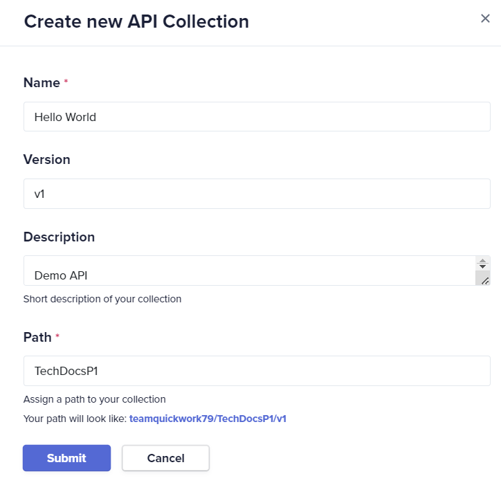 - Provide a Name, Version number, and a brief Description of the API collection. For this example, enter the name Hello World.