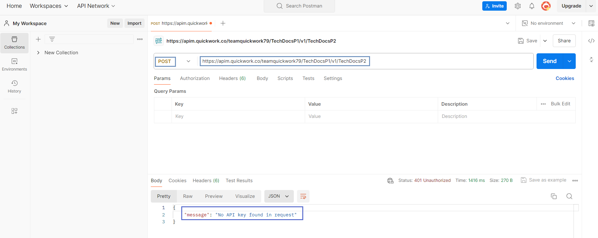 To test the API endpoint, we will use Postman, which is a tool for invoking and evaluating APIs. It allows you to test newly created APIs within Quickwork's API Management tool.