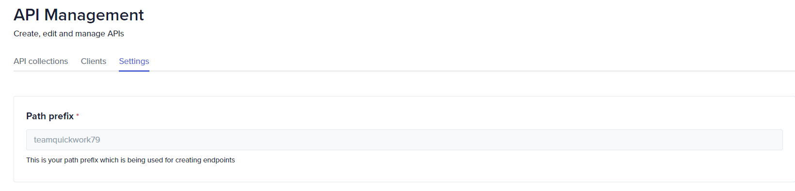- If this is your first API, you will be prompted to create a Path prefix. Enter teamquickwork79 as the prefix and click Save. This prefix will then be utilized as the base for creating API endpoints. You will see a confirmation message, and the Path prefix will appear under the Settings tab.