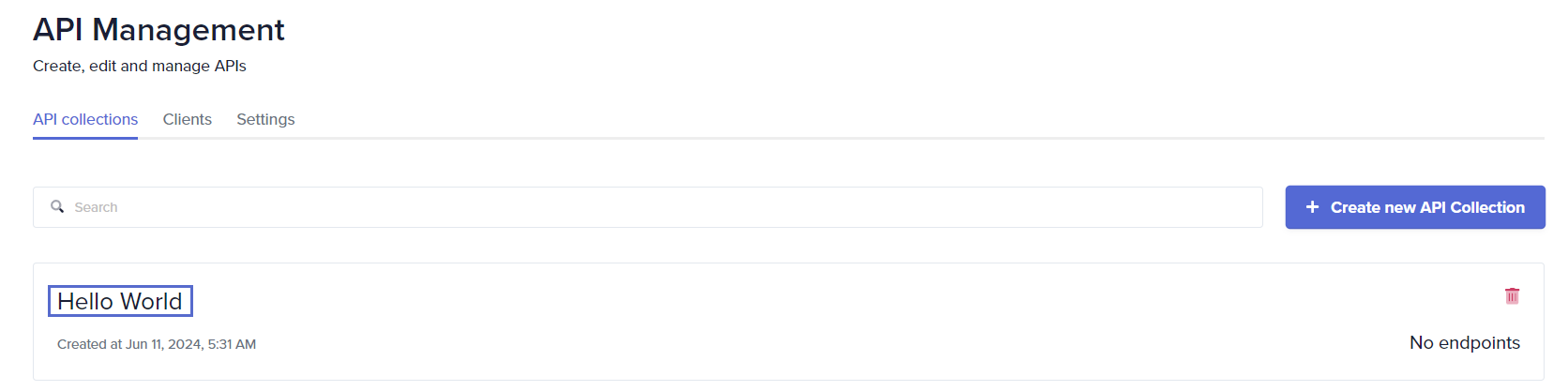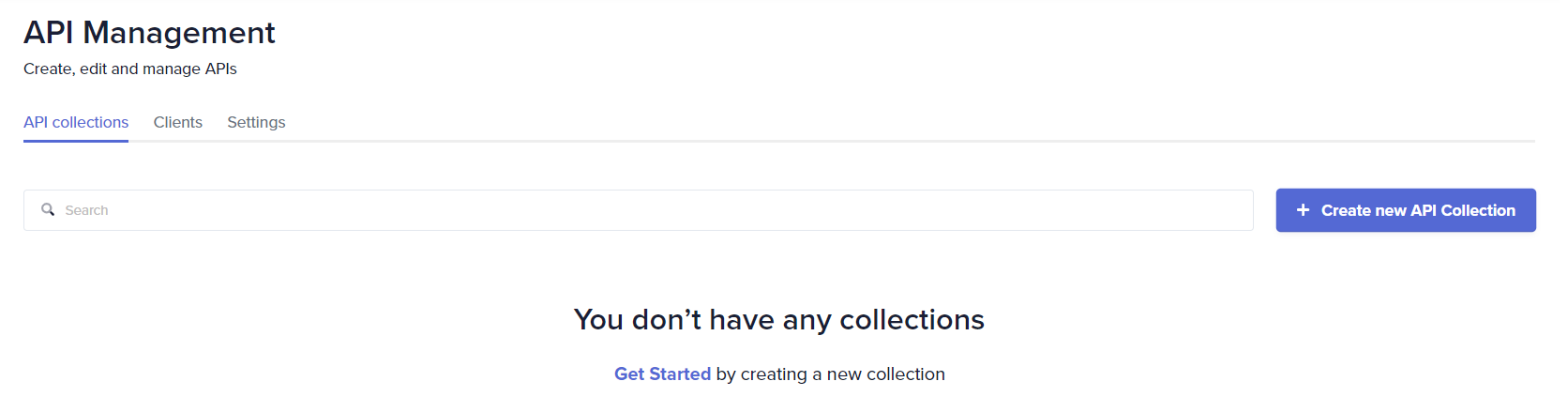 - Switch to the API collections tab and click the + Create new API Collection. If you don’t have any collections, begin by clicking on Get Started by creating a new collection link.