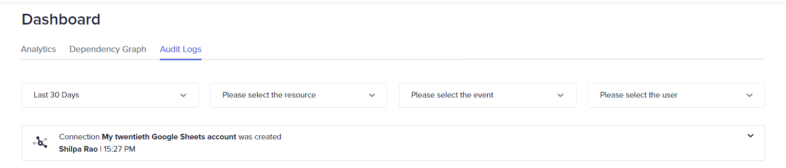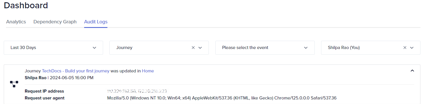 Event: You can filter logs based on specific events associated with the selected resource (For example, if resource is Journey, events are journey creation, updation, cloning, starting, stopping, moving, or deletion).