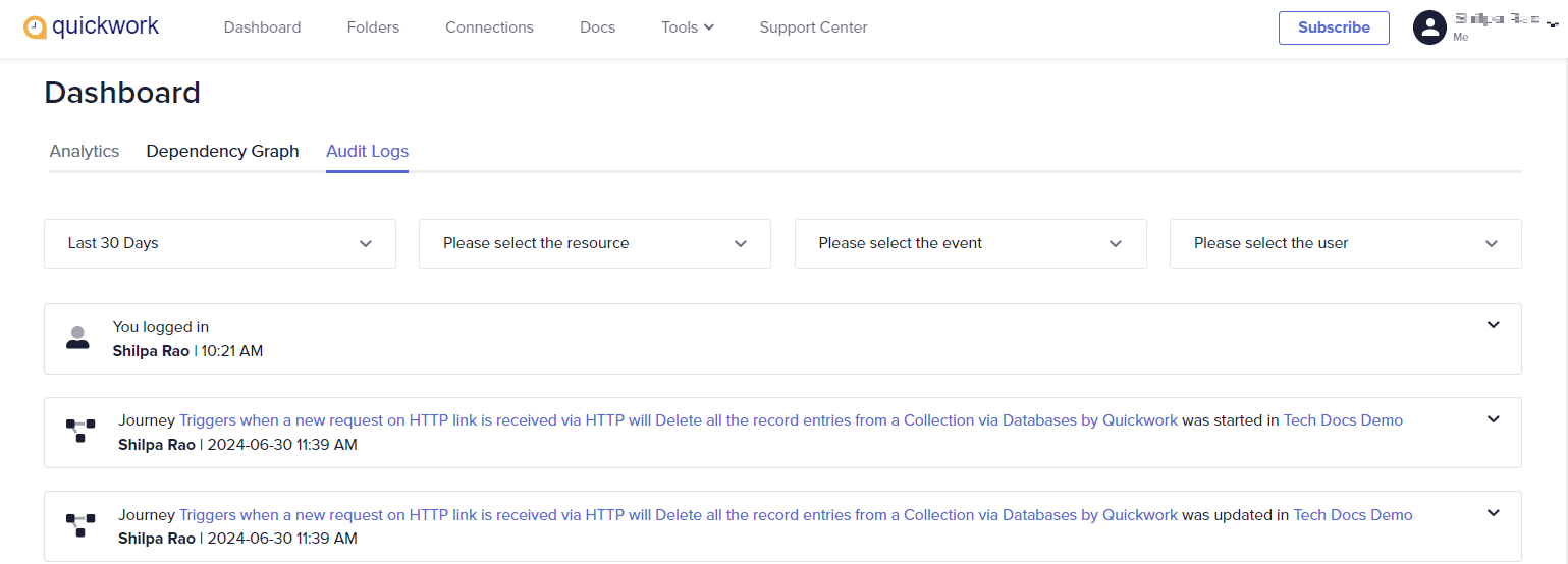 Audit logs are essential records that track every activity performed within your Quickwork account. They provide a detailed account of operations on various components, such as journeys, folders, and connections, performed by users and teams. By capturing details like user actions, timestamps, IP addresses, and system information, audit logs help monitor and audit activities, ensure transparency, and maintain security.