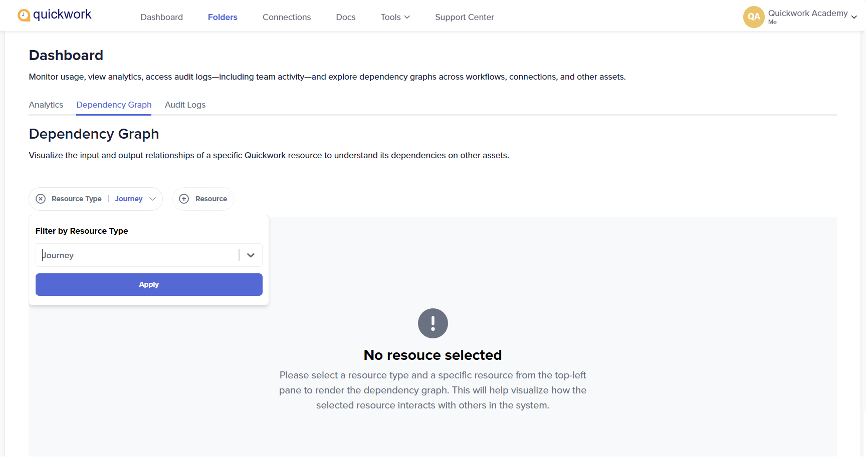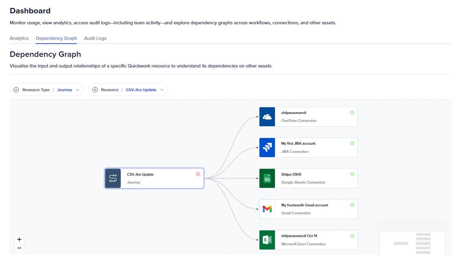 The Dependency Graph page lets you visualize how a selected Quickwork resource, such as a journey, database, or connection, interacts and depends on other assets within your workspace.