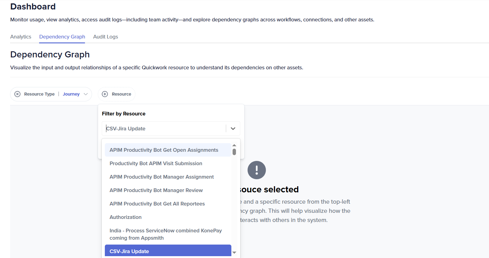 - After selecting a Resource Type, use the Resource drop-down to choose the specific item whose dependencies you want to view.