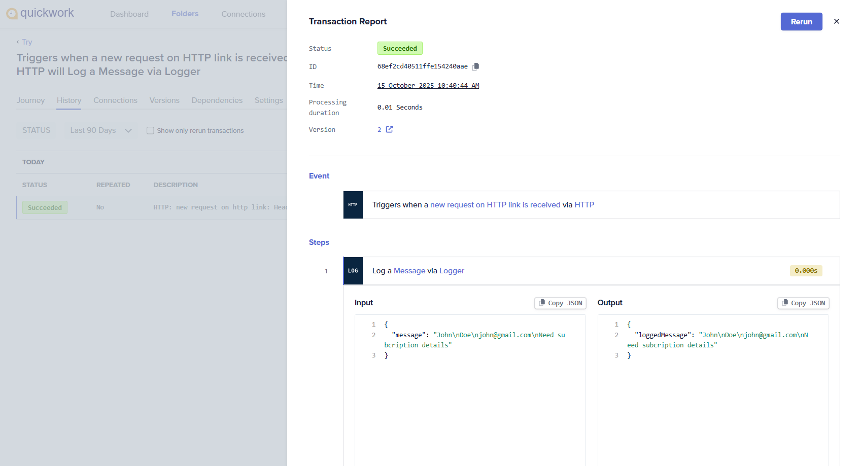 Verify the logged data in the History tab of Quickwork to ensure the HTTP trigger is capturing form responses correctly.