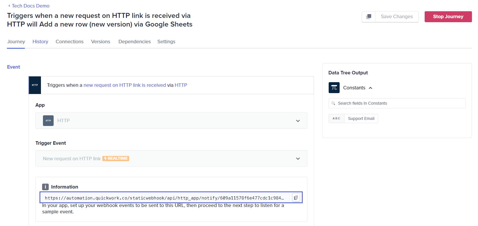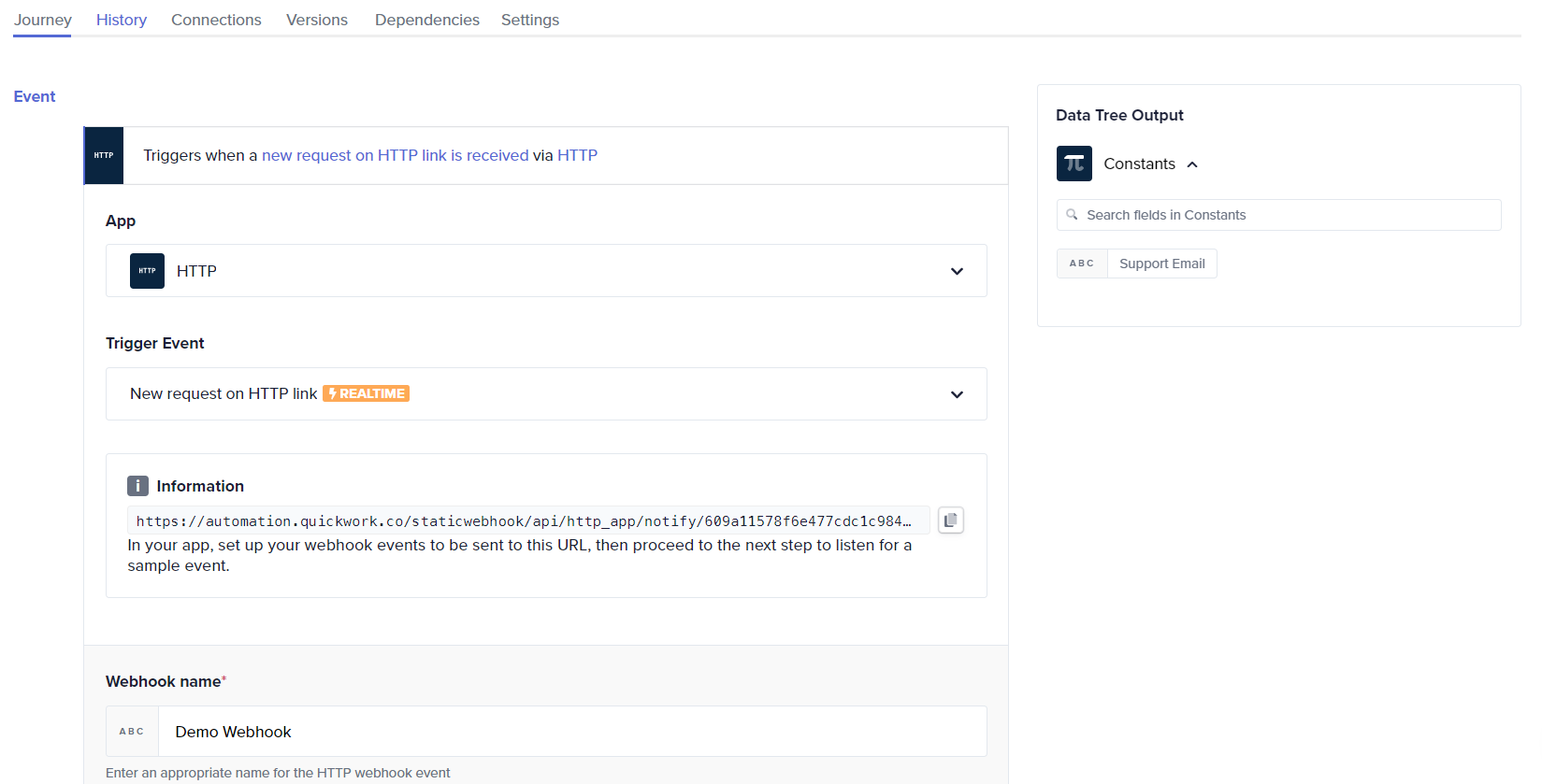 The HTTP app in Quickwork allows you to receive data from any external application through a webhook URL. It acts as a universal entry point for journeys, enabling automation when an external service, such as a form, API, or custom system, sends data to Quickwork.