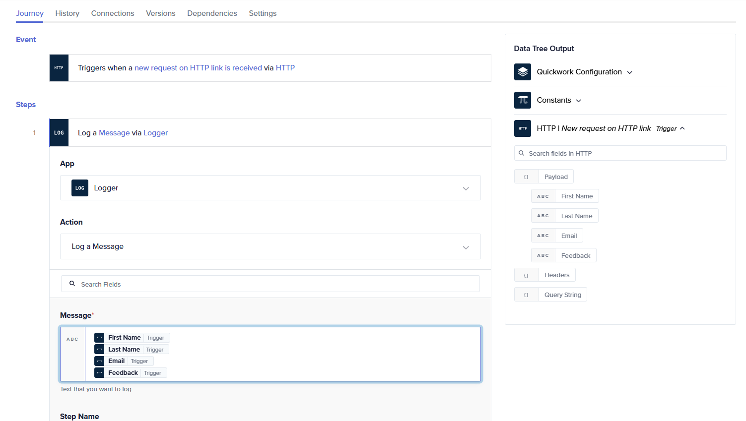 Choose the Logger app in Quickwork and select Log a Message as the action.