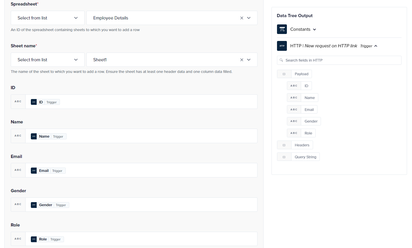 - Set up data entry: Map the data fields from the webhook to the corresponding columns in Google Sheets using data pills. This step ensures that each piece of data from the webhook is correctly placed into the Google Sheet.