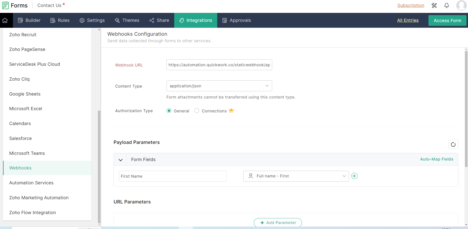 - Webhook not triggering: Ensure the external system (e.g., Zoho Forms) supports webhook integration and that the Quickwork webhook URL is correctly pasted in its configuration.