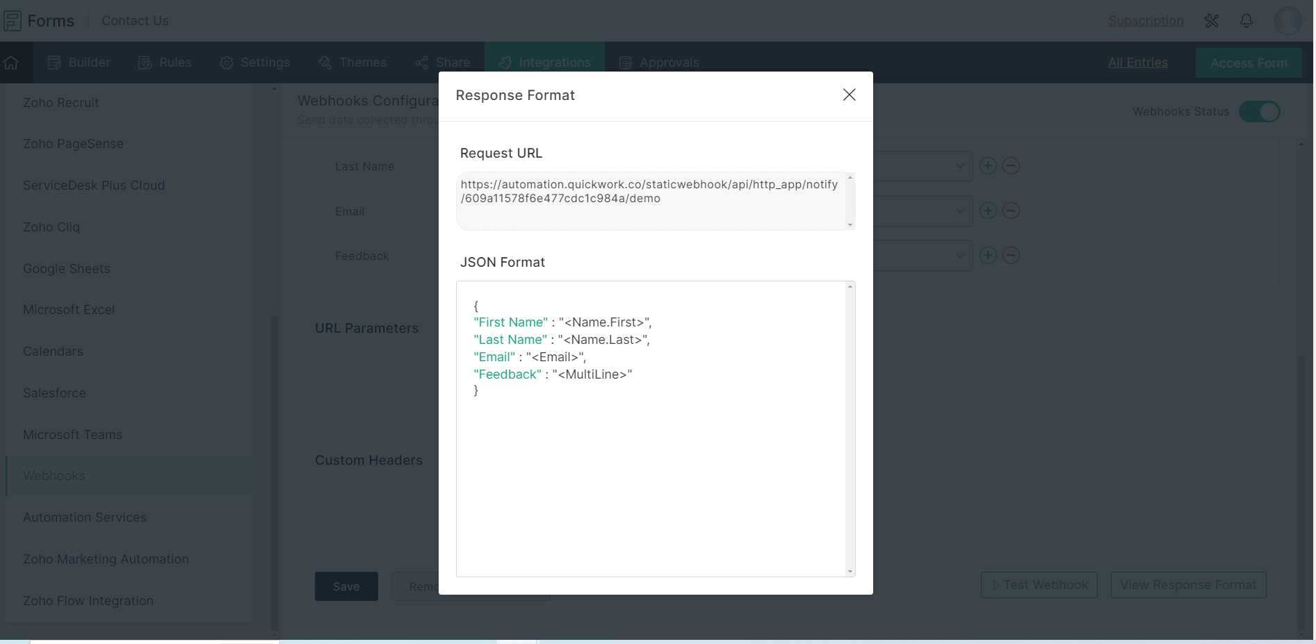 - Save your settings and click View Response Format to see the JSON format of the form response.