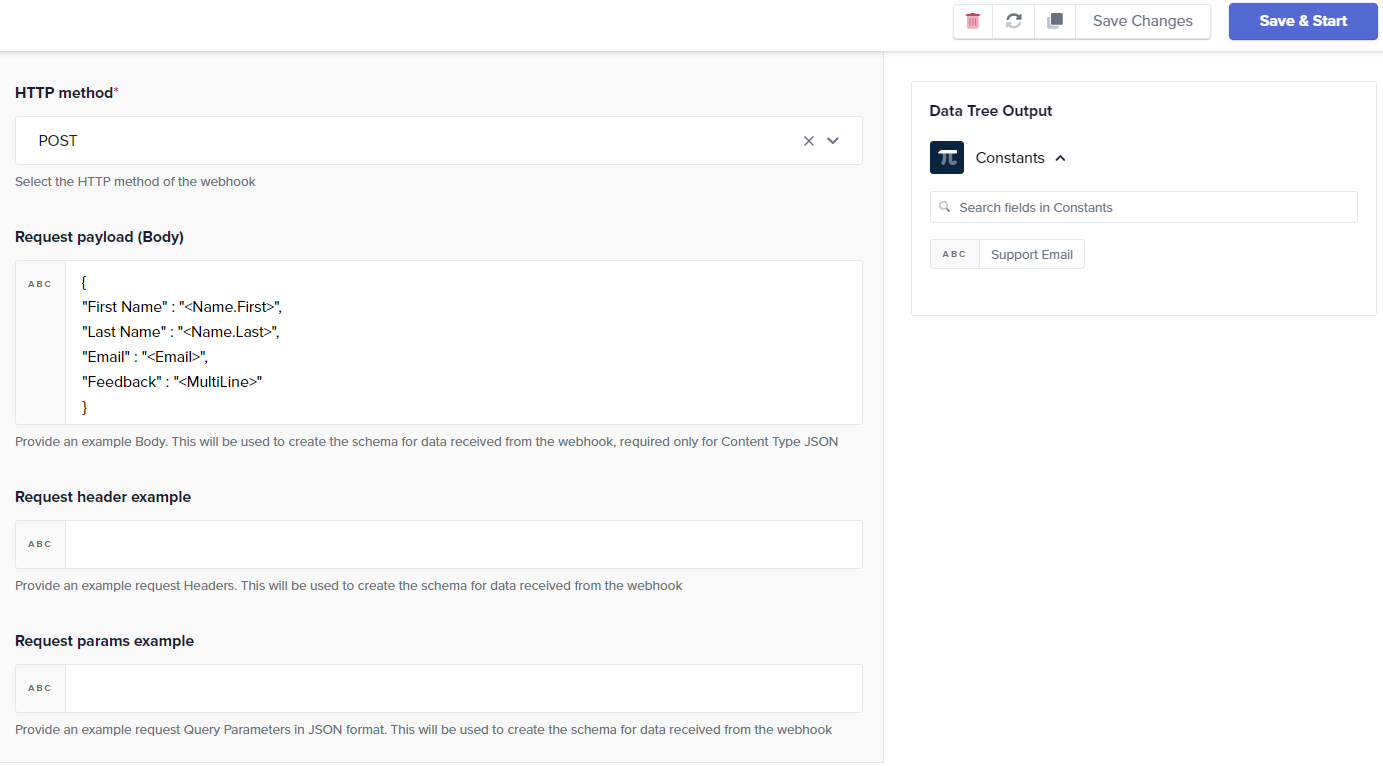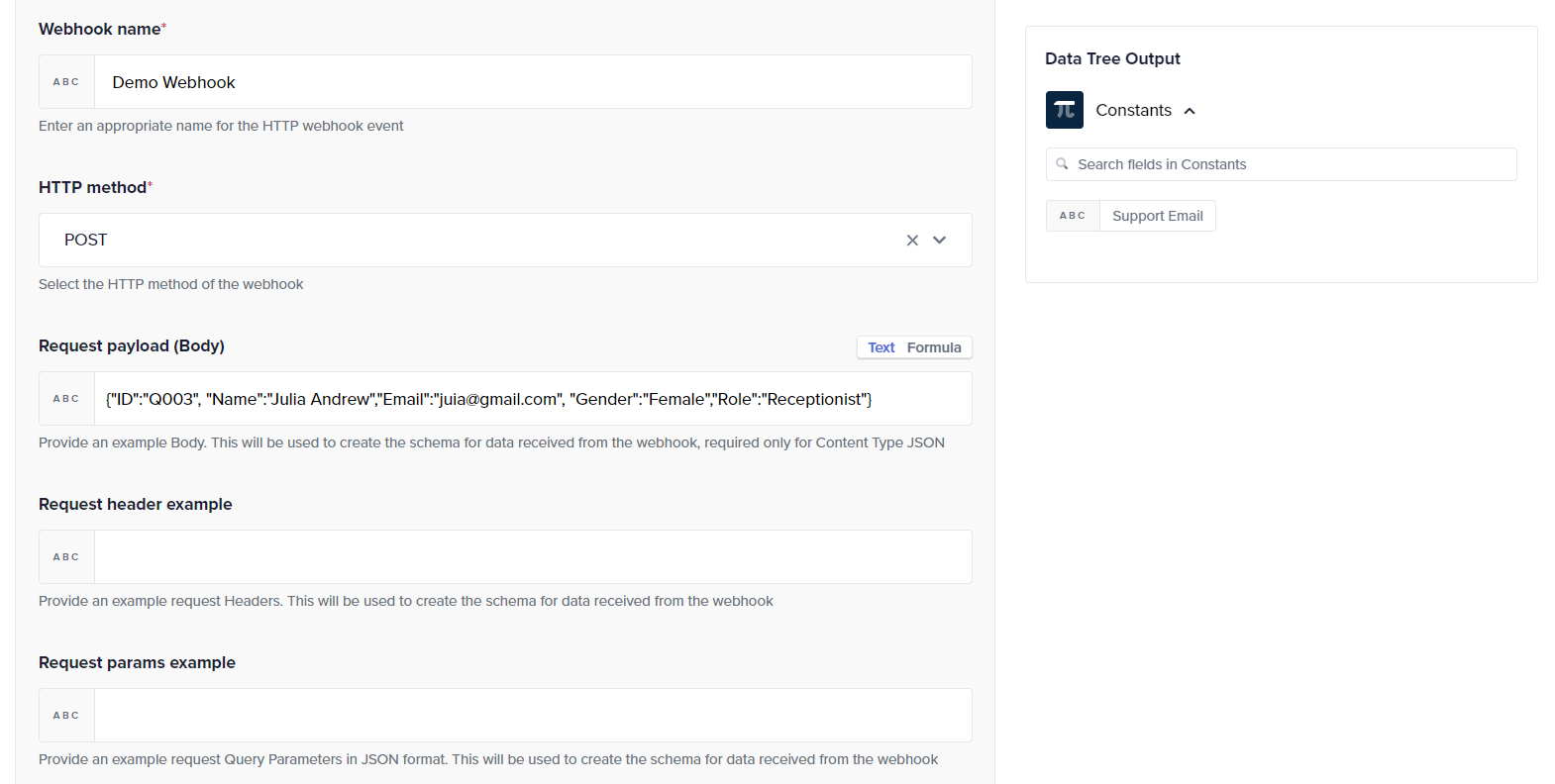 Specify the Request payload (Body) to allow the webhook to capture the necessary data. Provide an example of a body in JSON format, which will be utilized to construct the data schema for the information received from the webhook.