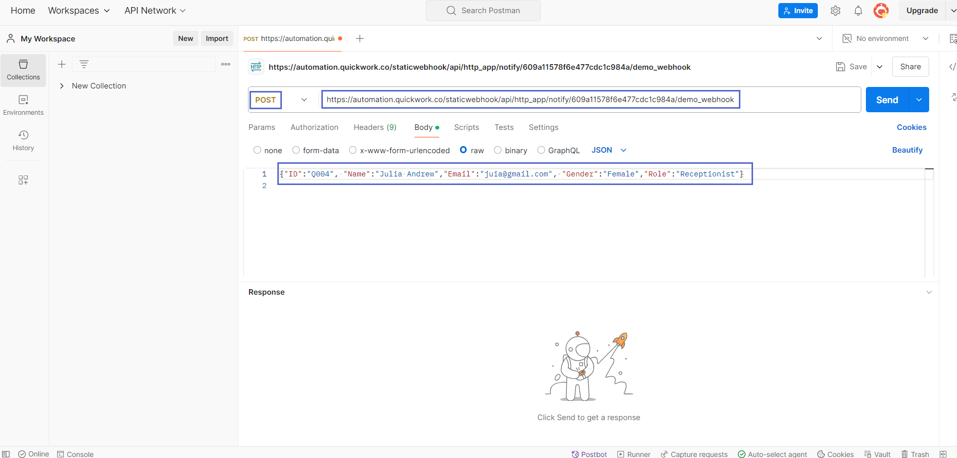 Send the request: Click the Send button to transmit the data payload to the specified webhook URL and trigger the associated action in Quickwork.