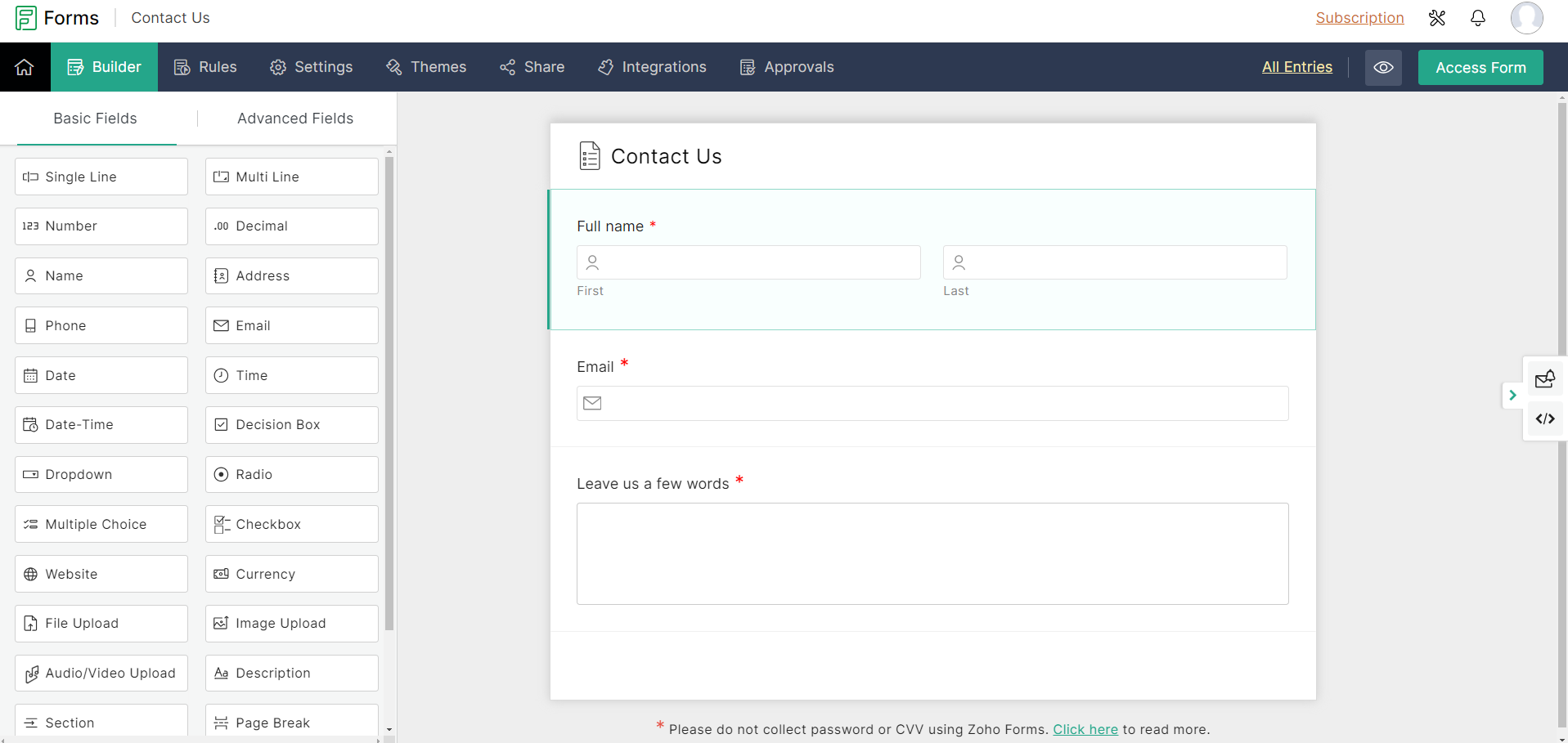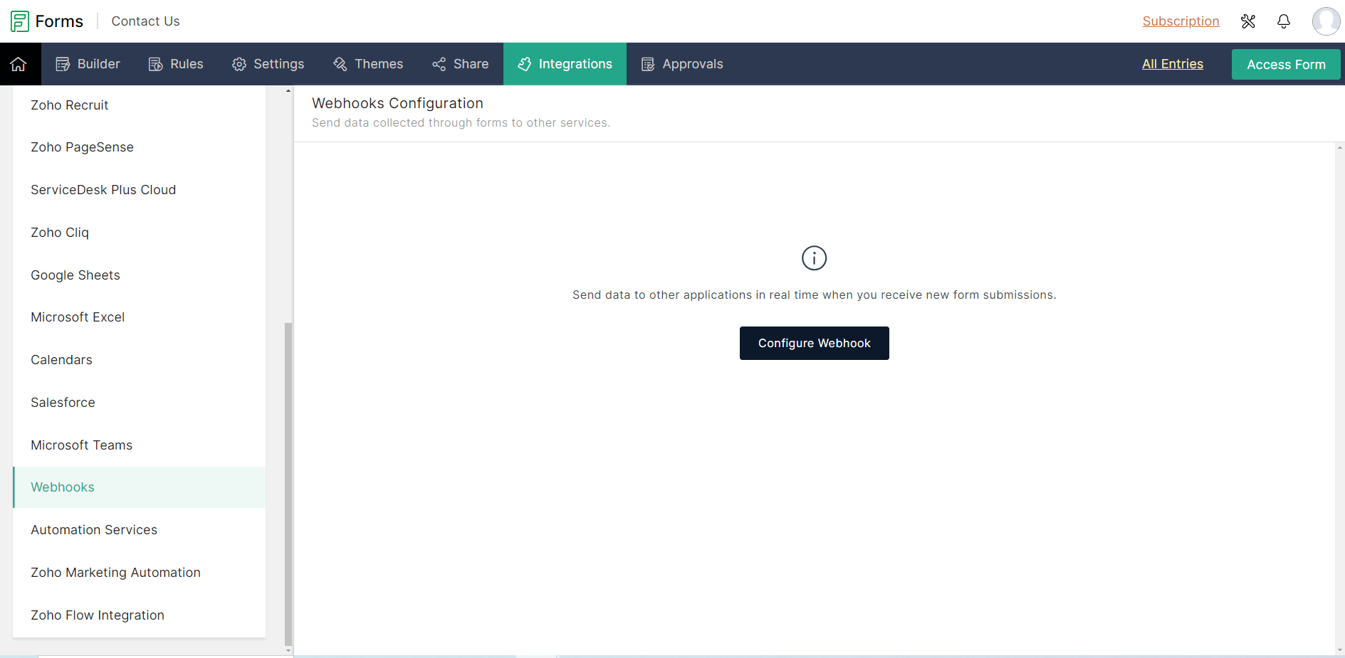 - Create a new form from scratch or select a pre-built template, such as the Contact Us form.