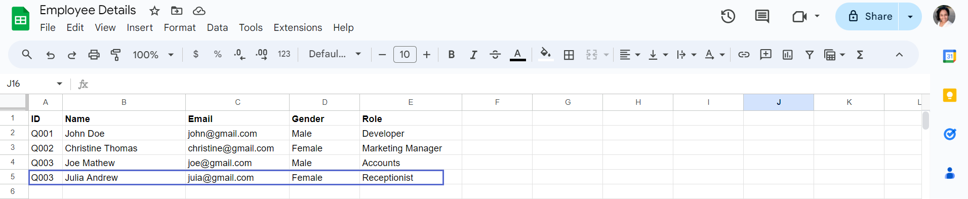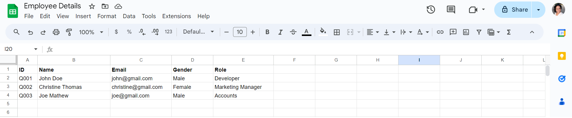 - Visit the Google Sheet to confirm that a new row has been added with the details submitted.