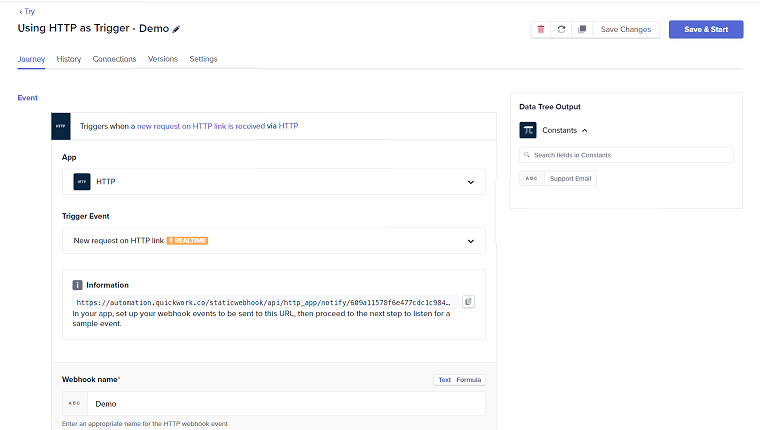 Enter a descriptive Webhook name, such as Demo Webhook. Upon naming, Quickwork automatically generates a custom webhook URL with the trigger name appended.