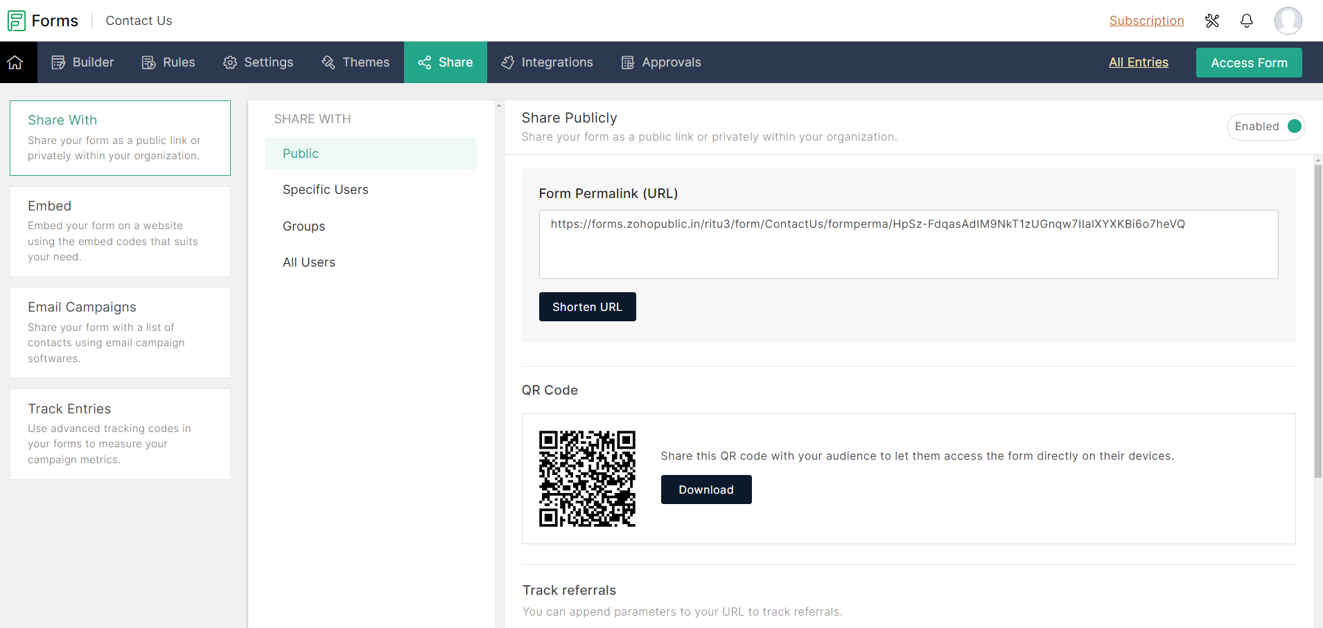 - Go back to Zoho Forms and obtain the shareable link of the Contact Us form by navigating to the Share tab.