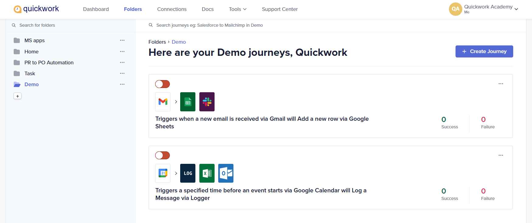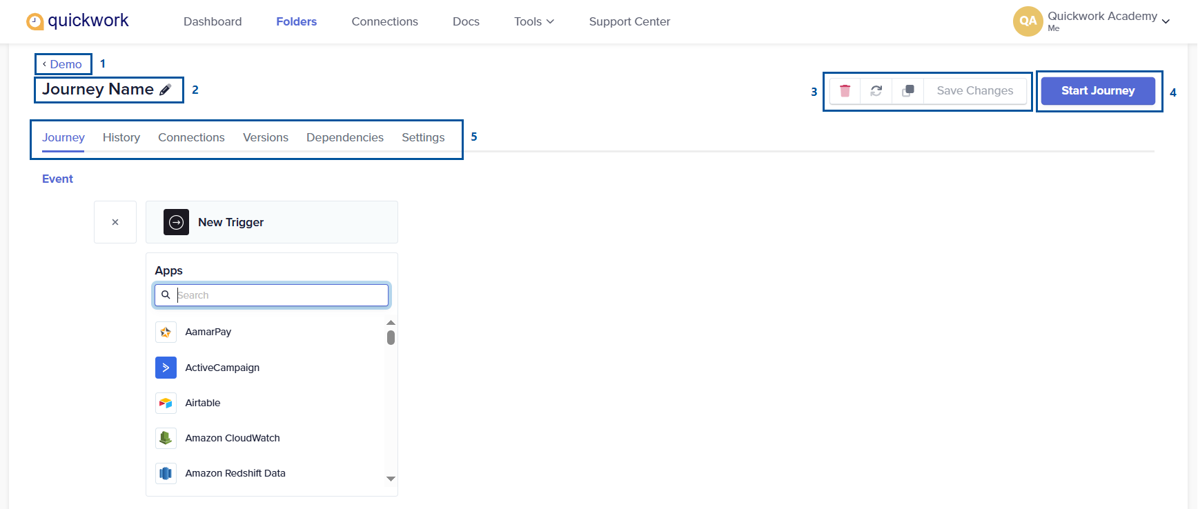 This section will help you navigate Quickwork's journey configuration manager, where you can configure triggers and actions, run a journey, check journey history, switch app connections, share and control journeys, including cloning, deleting, and starting/stopping them.