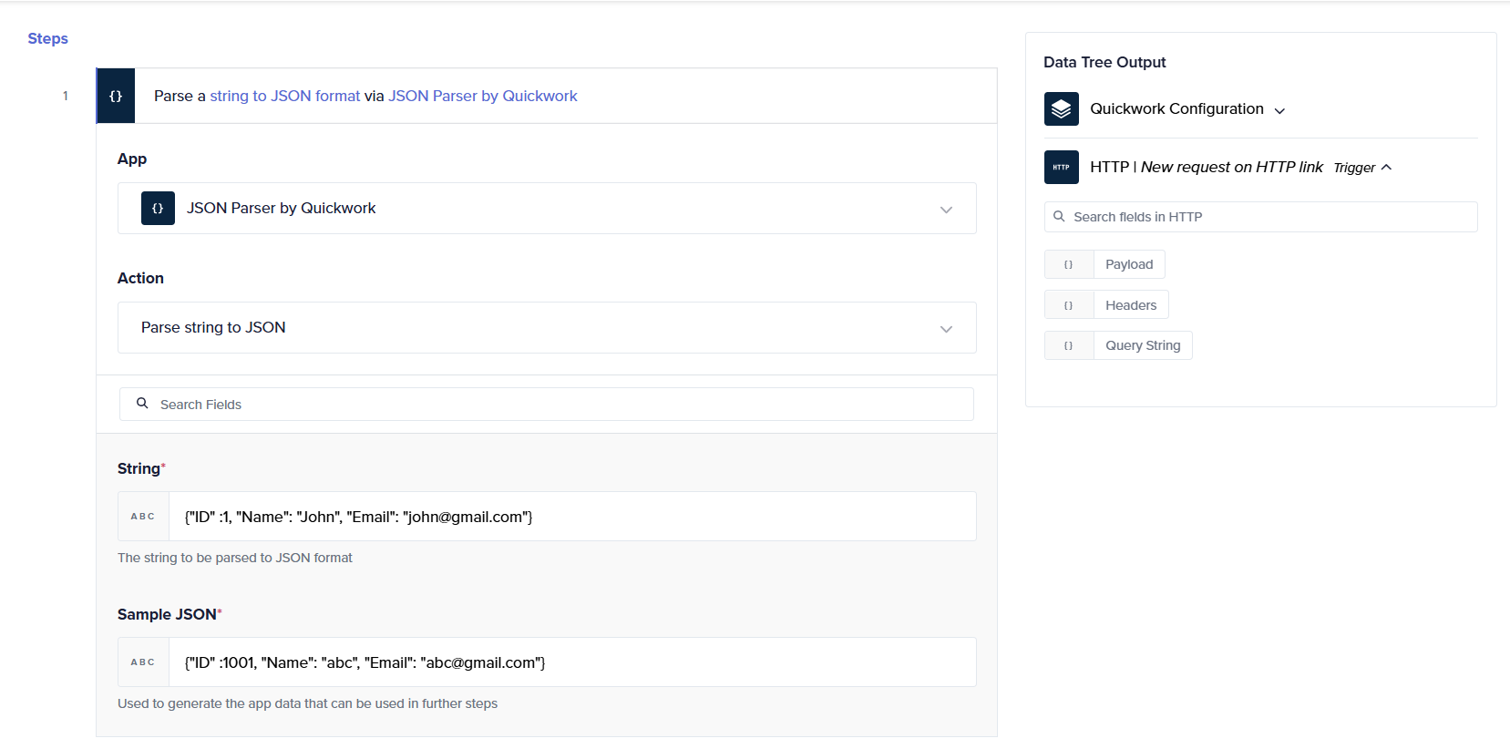 - Select JSON Parser by Quickwork and Parse string to JSON action.
