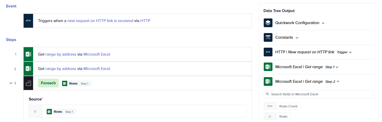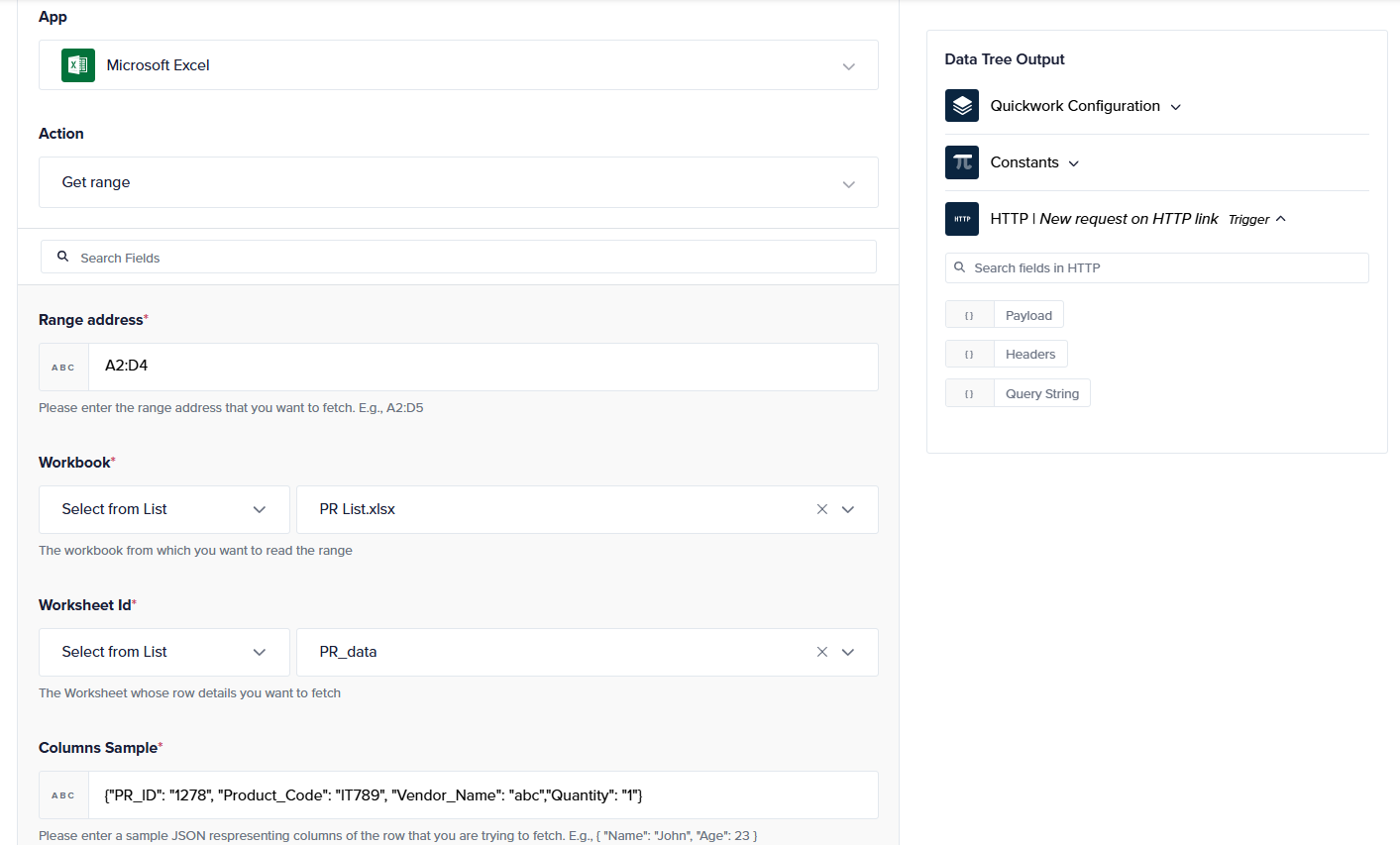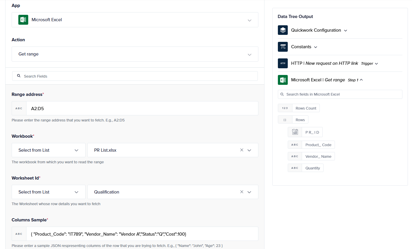 Set up the action Get range (PR_data) via Microsoft Excel to fetch purchase request details from Excel.