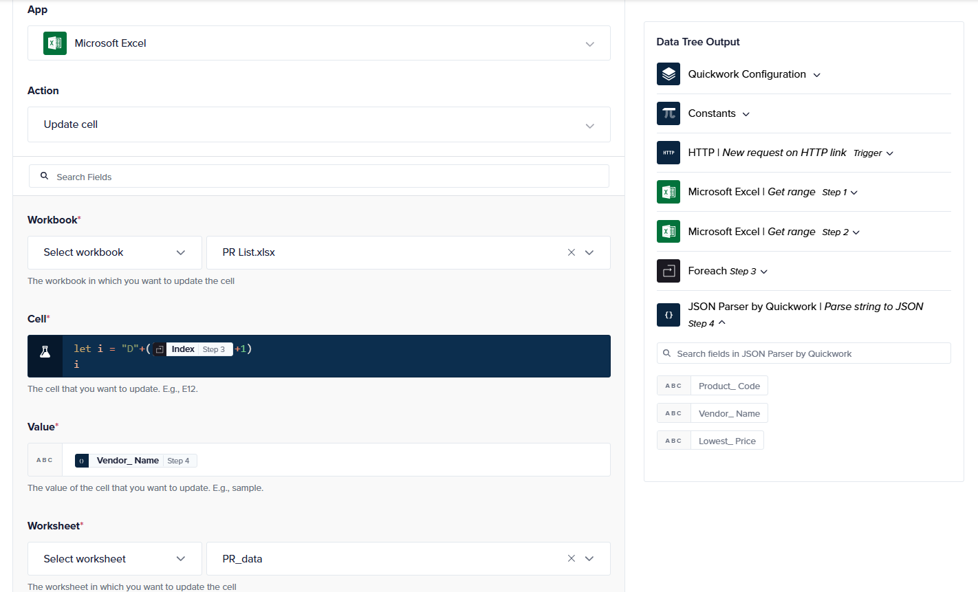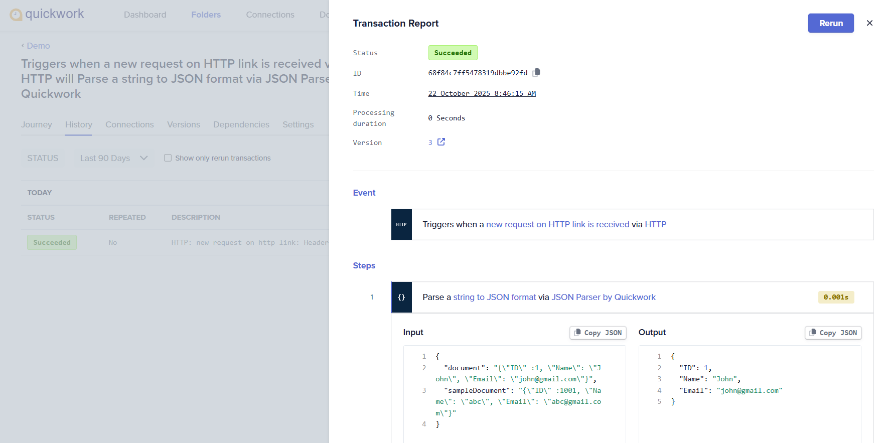 This automation is made possible through the JSON Parser by Quickwork, which seamlessly converts the JavaScript output into structured data, allowing dynamic mapping and smooth data flow between steps, eliminating the need for manual lookups or complex formulas.