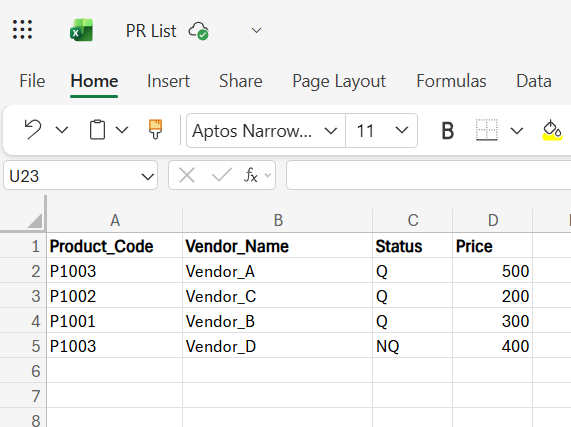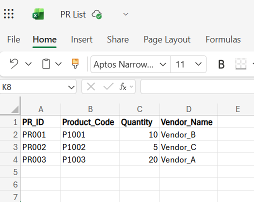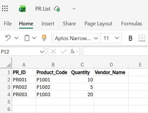 - To view the results, open the PR_data sheet in Excel. You will see the Vendor_Name column updated automatically. In the background, the journey reads each PR_data entry, compares it against the Qualification sheet to find the lowest-cost qualified vendor, formats this result as JSON, and writes the selected vendor name back to the corresponding PR_data row.