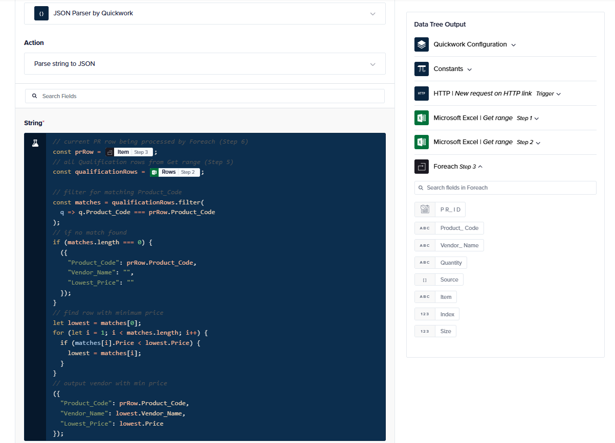 Parse string to JSON via JSON Parser by Quickwork to compute and format the lowest-cost vendor details for each product.