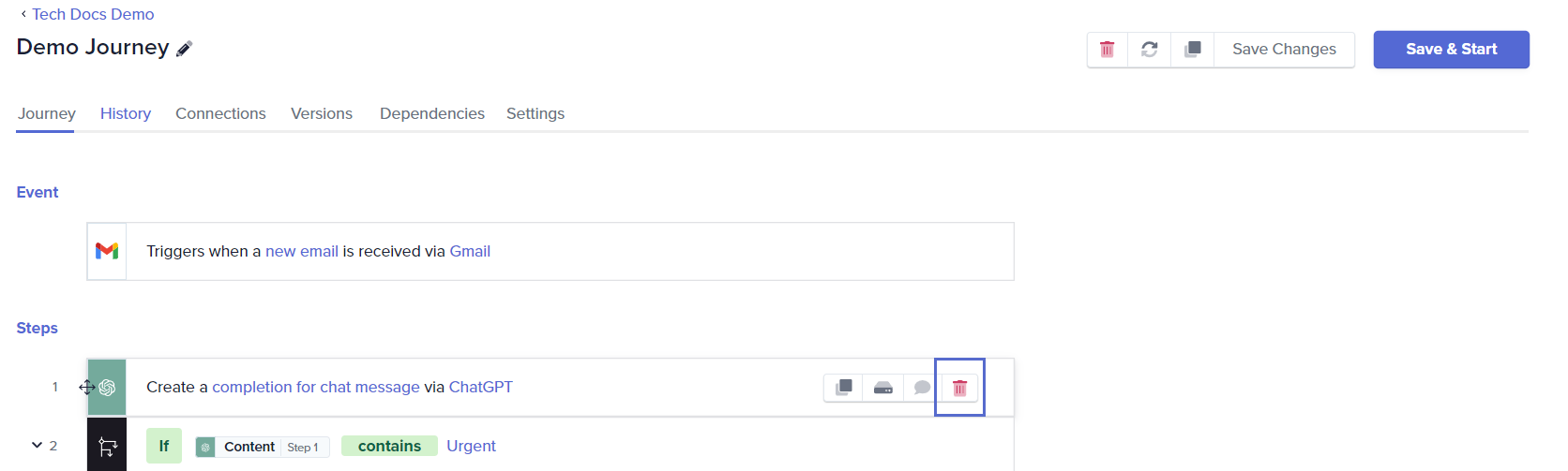 Deleting a step removes the step from the journey. Be certain about deleting a step, as it affects the journey's execution. Note that triggers cannot be deleted since they initiate the journey. Here’s how you can delete a step: