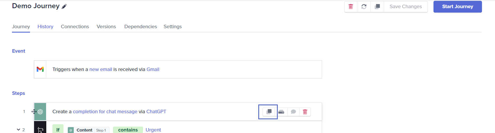 Cloning a step creates an exact replica of the original action, including defined input fields, data pills, established connections, and scripted formulae. This applies to simple actions and conditional blocks. Note that triggers cannot be cloned since a journey can only have one trigger.