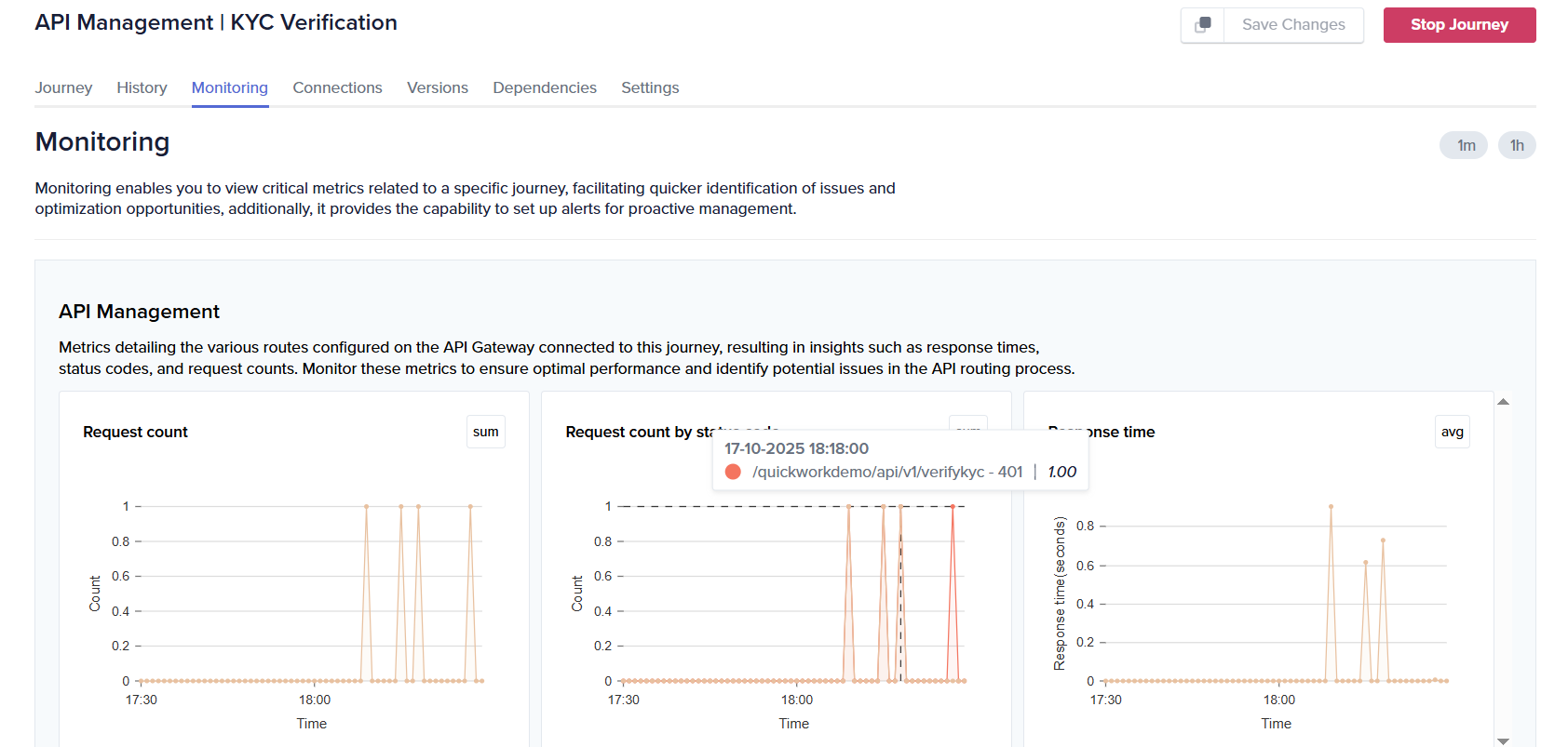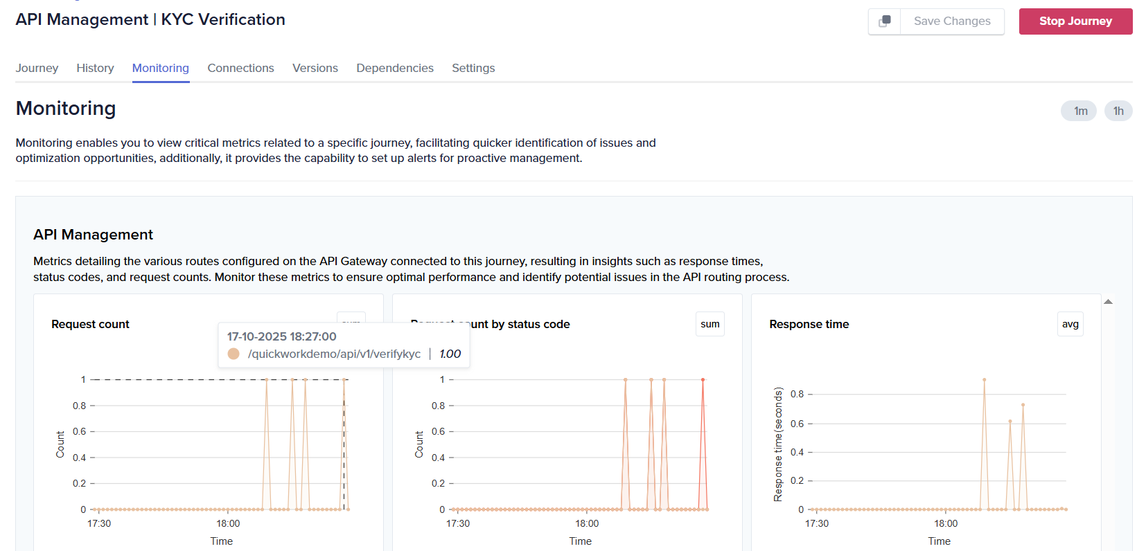 - In this example, a request was made to the /quickworkdemo/api/v1/verifykyc endpoint at 18:27 PM. By moving the pointer over the Request count graph, a tooltip appears showing detailed metrics such as the timestamp, endpoint name, and request count (1.00). This confirms that the API gateway successfully received and processed the request.