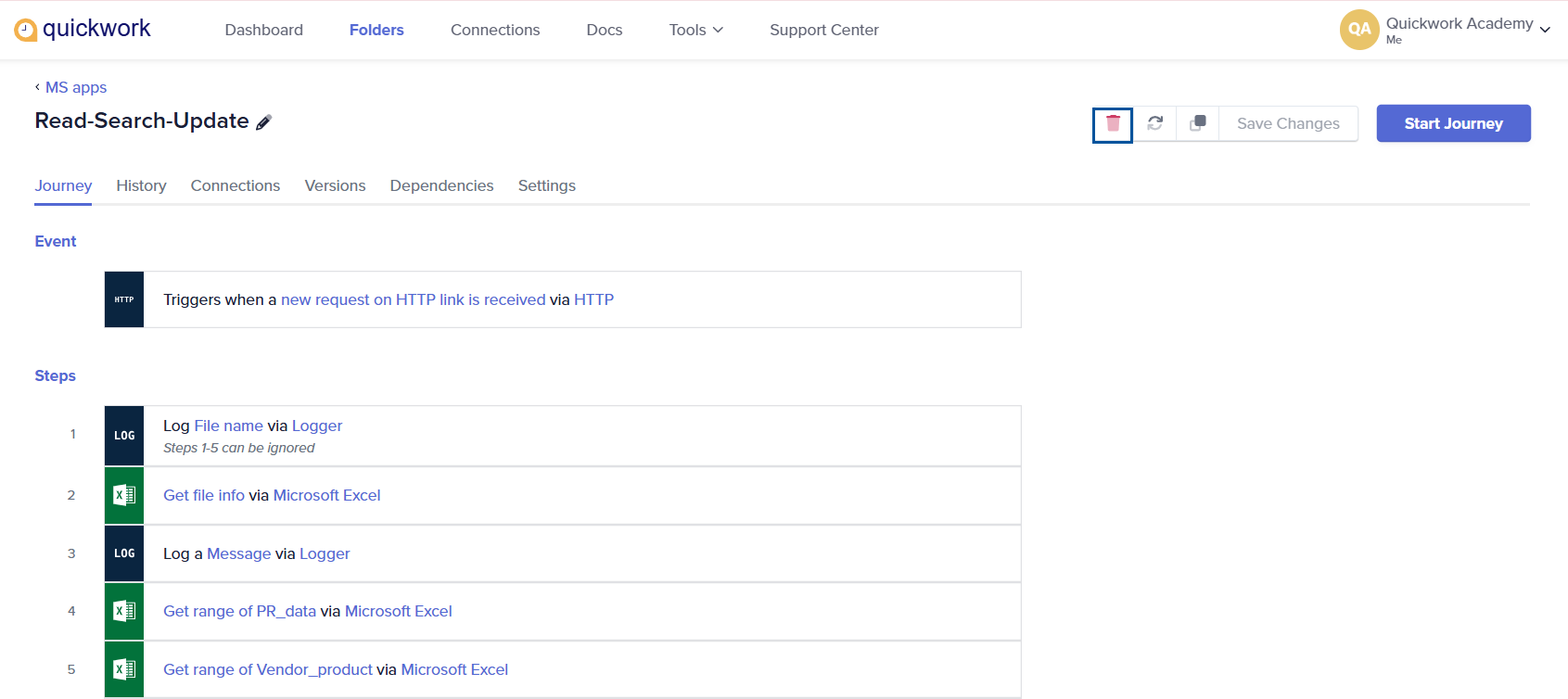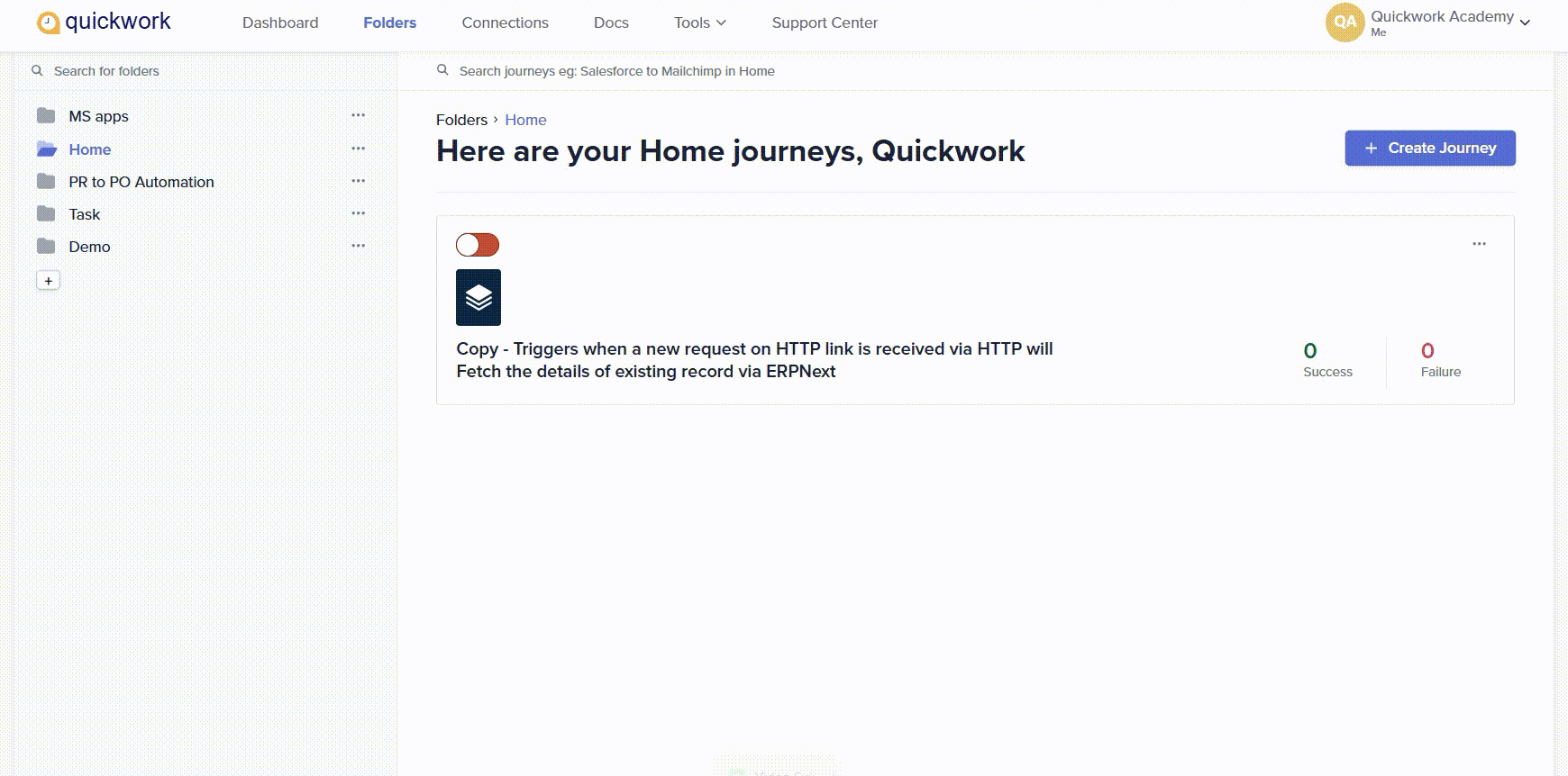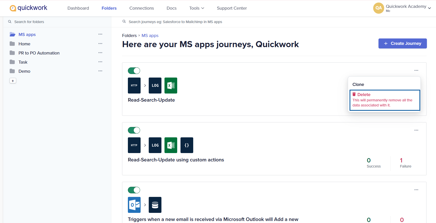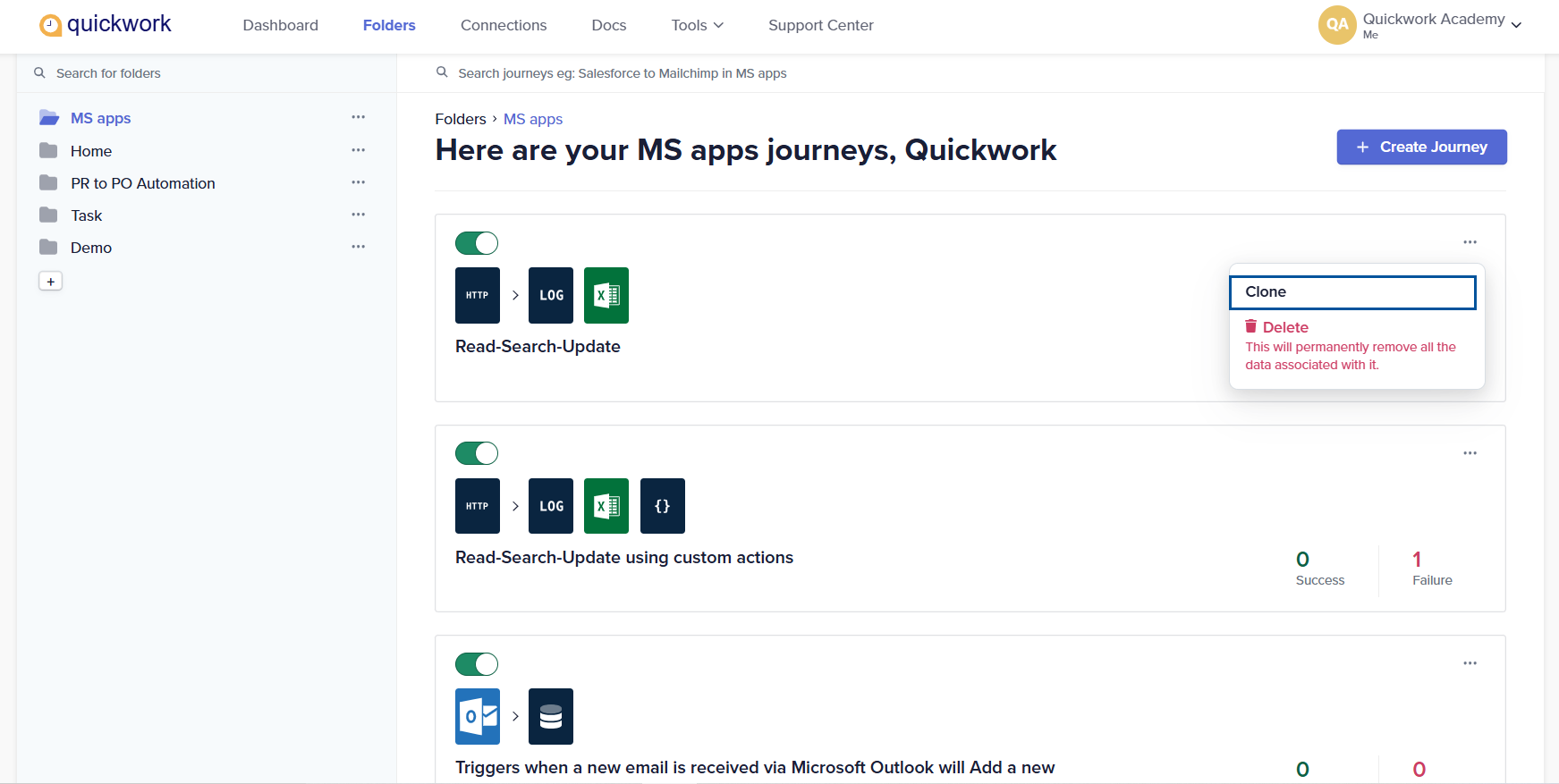 This section covers how to manage and organize your journeys in Quickwork, including moving them between folders, cloning, and deleting journeys.