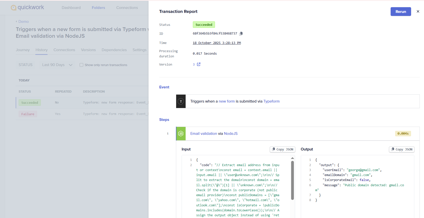 - Navigate to the History tab in Quickwork to verify the execution and view the output data.