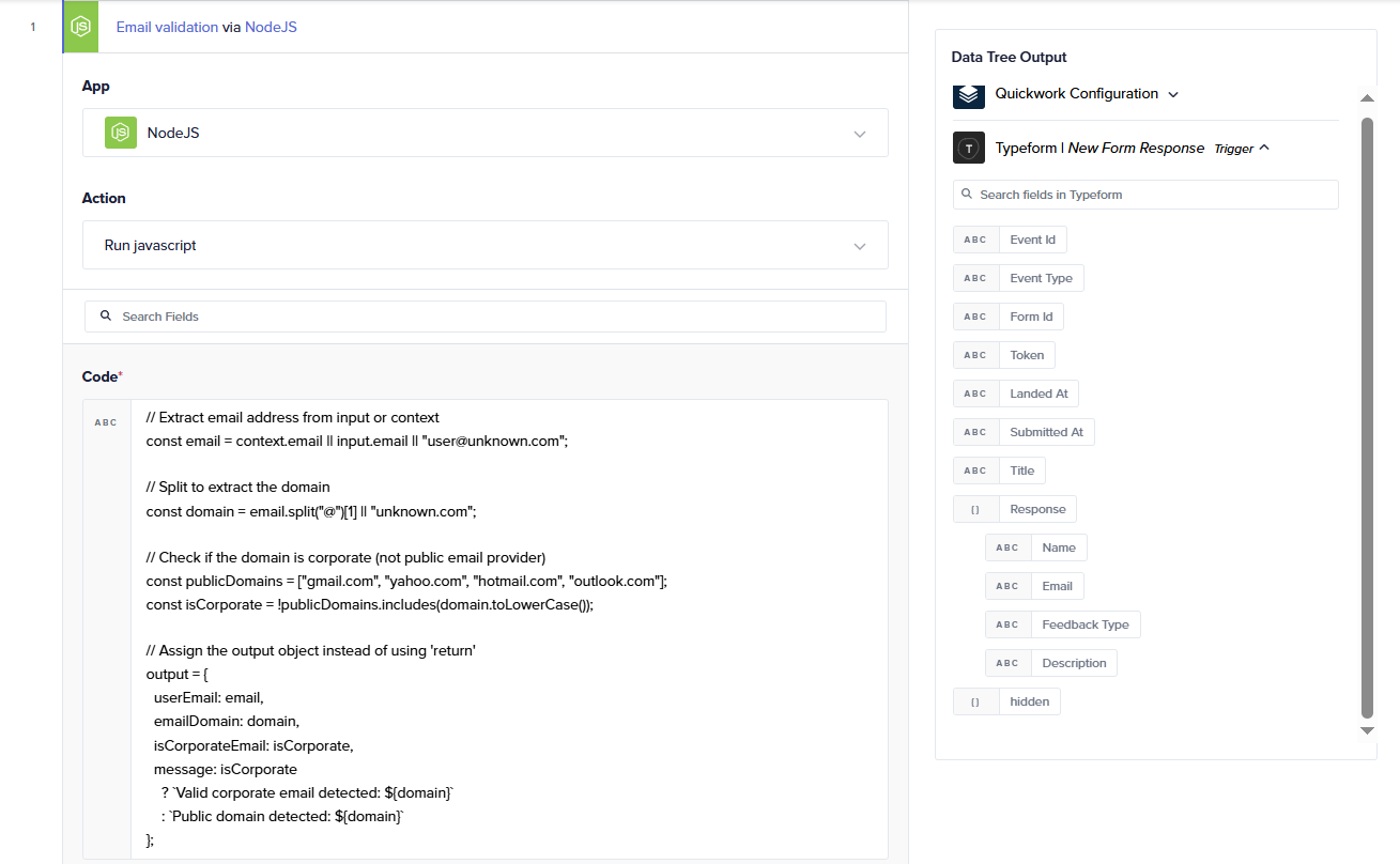 Add JavaScript code: Write the code that extracts the email received from Typeform, isolates its domain, and checks if it belongs to a public provider like Gmail, Outlook, Yahoo. It then marks the email as corporate or public and returns this information in a structured JSON format for use in the next steps of the journey.