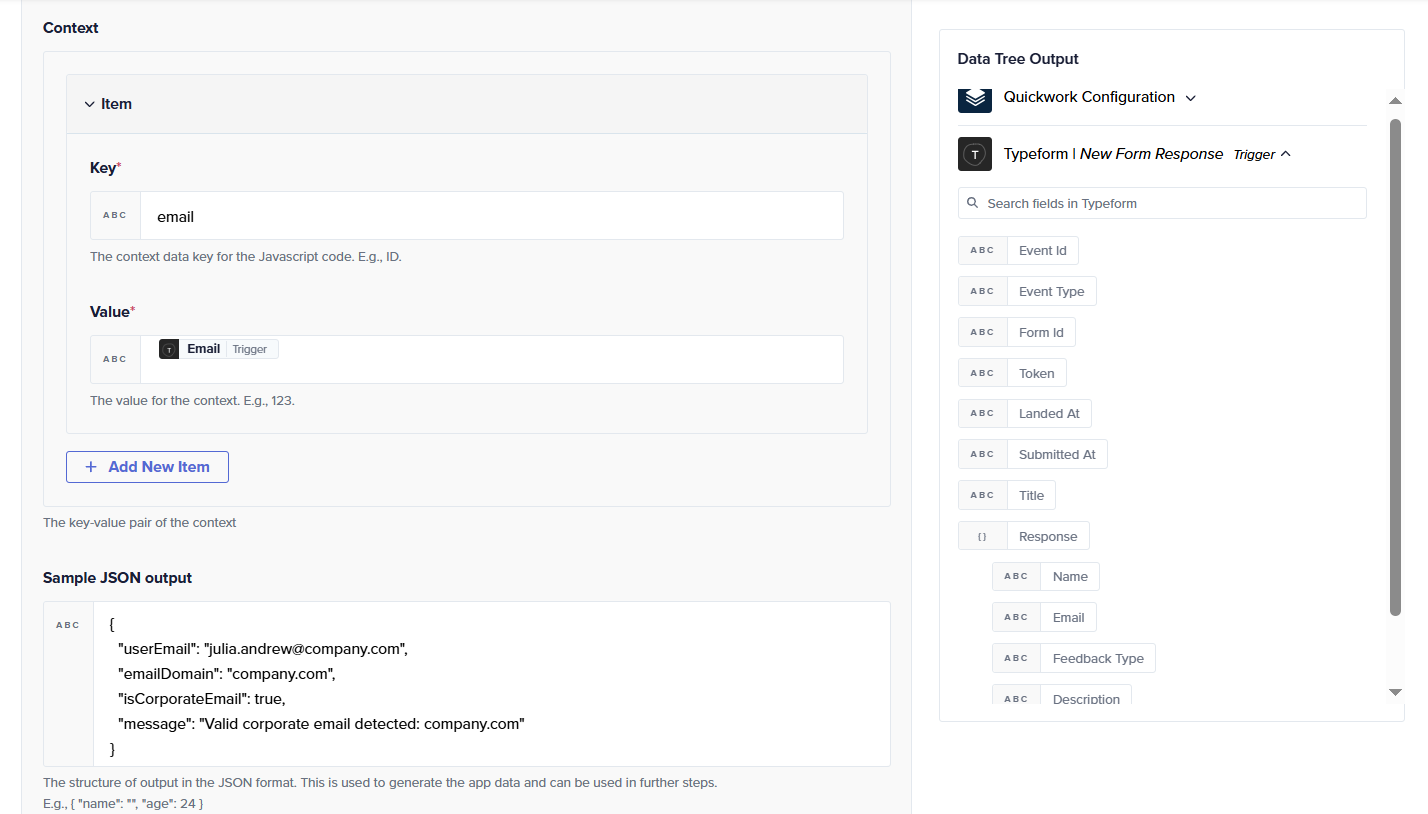 In the above use case, the context object provides input data to the NodeJS code, such as the email received from the Typeform trigger. It acts as a key–value store that lets you reference dynamic data within the script without hardcoding values. In this case, context.email fetches the user’s email submitted via Typeform. The code then processes this value, extracts the domain, checks whether it’s a public or corporate email, and finally stores the result in the output object. The output holds the processed information, email, domain, validation status, and message, which is then passed to subsequent journey steps such as Salesforce as data pills for further automation.