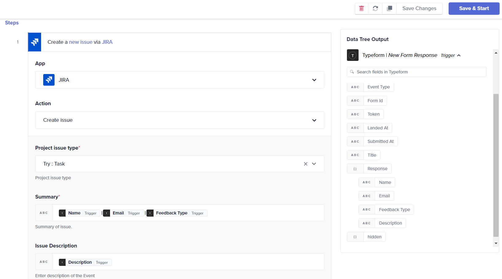 Drag and drop the data pills Name, Email, Feedback Type from Typeform | New Form Response trigger in the Data Tree Output and map them to Summary, Issue Description, and other relevant input fields in JIRA.