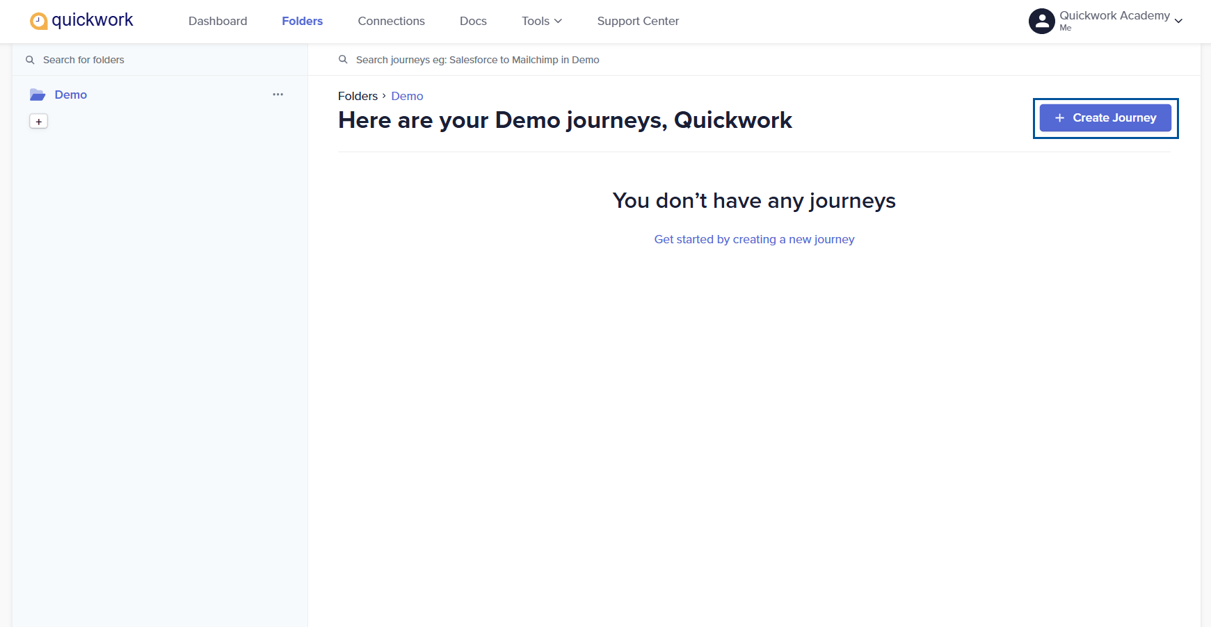 - In the Demo folder, no journeys are available yet. To get started, click + Create Journey and begin building your first journey.