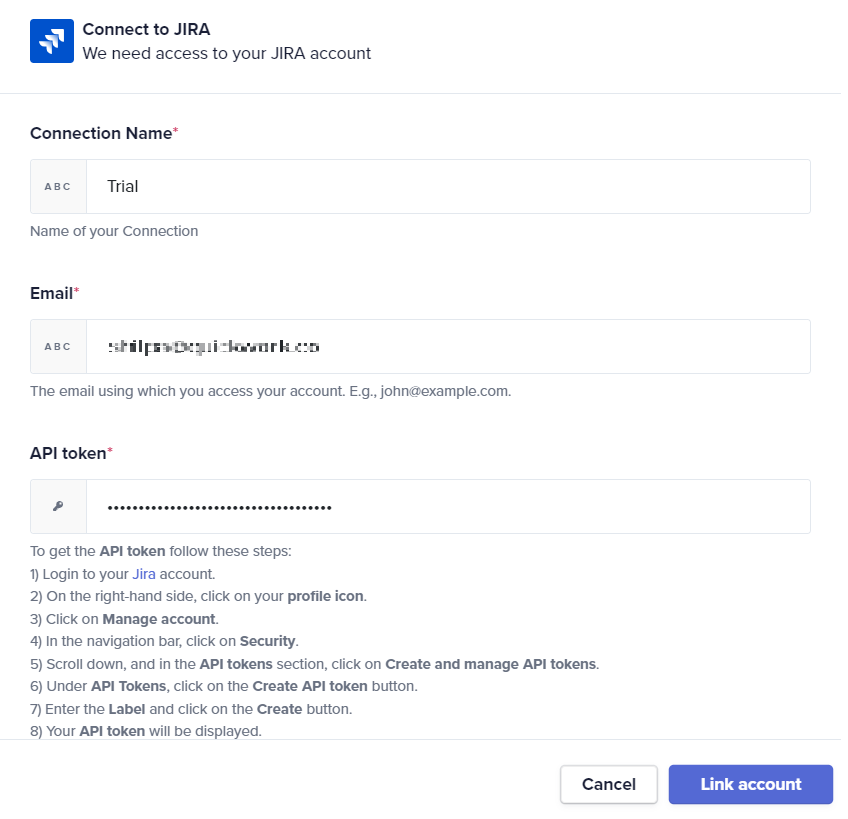 If not, click + Create new connection, Link an account, and follow the instructions to link your JIRA account in the Connect to JIRA window.