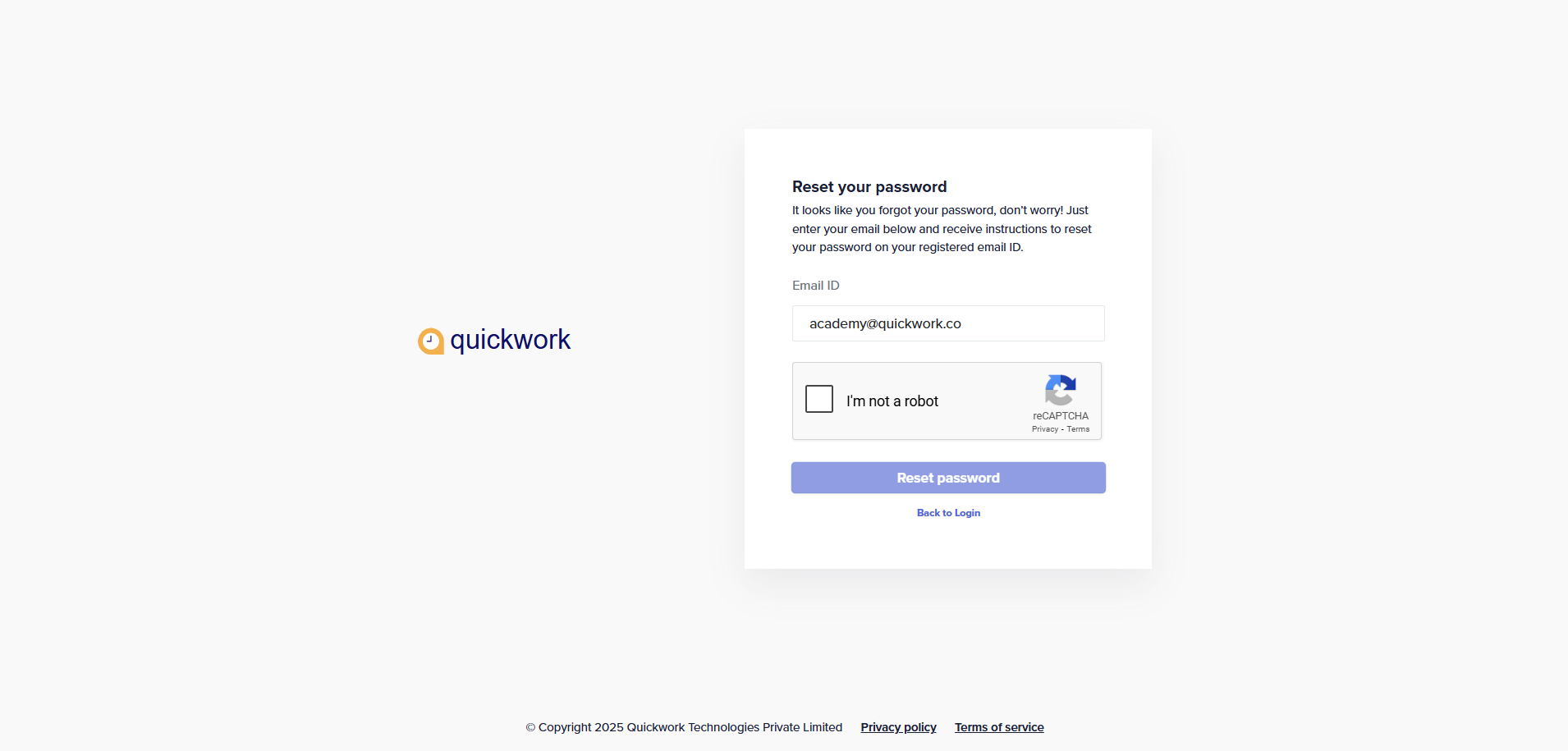 - Enter the email address associated with your Quickwork account, complete the reCAPTCHA verification by selecting the I’m not a robot checkbox.