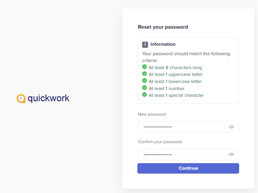 This section gives steps to securely reset your Quickwork account password.