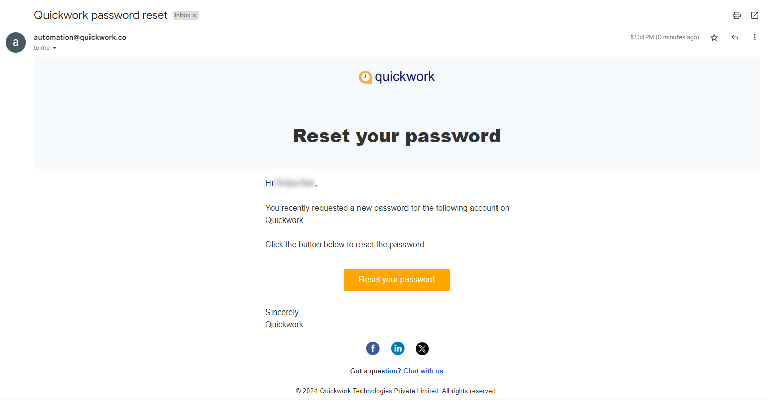 Open the email sent to your registered address with the subject Quickwork password reset and click Reset your password.
