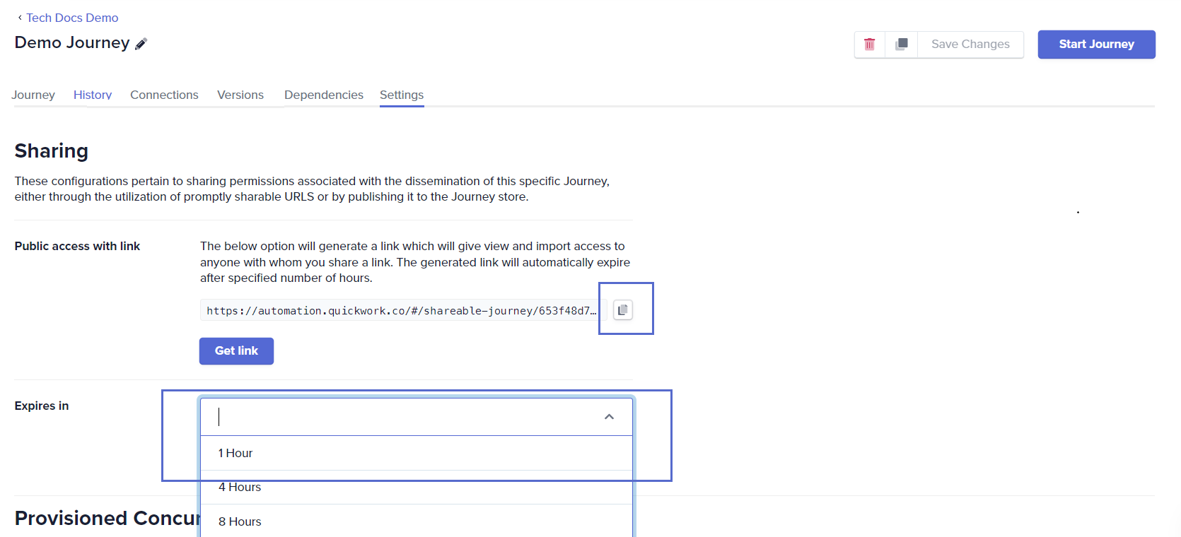 Sharing a journey in Quickwork is straightforward and efficient. The Settings tab allows you to generate a shareable URL. This public URL expires after the specified duration, ensuring security and timely access.