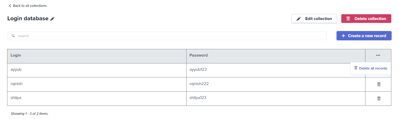 You can delete individual records by clicking the delete icon next to each row. To delete all the records at once, you can use the Delete all records option under the horizontal ellipse.