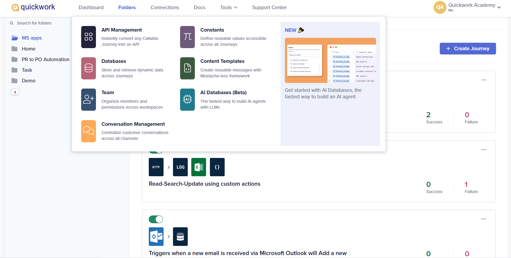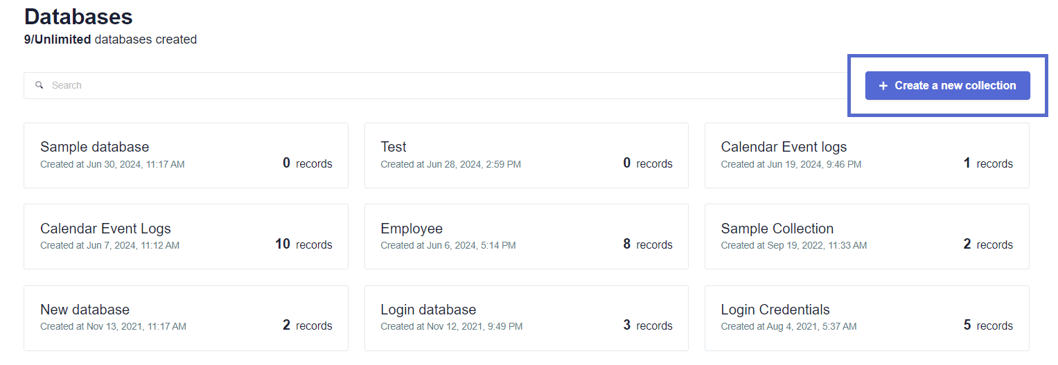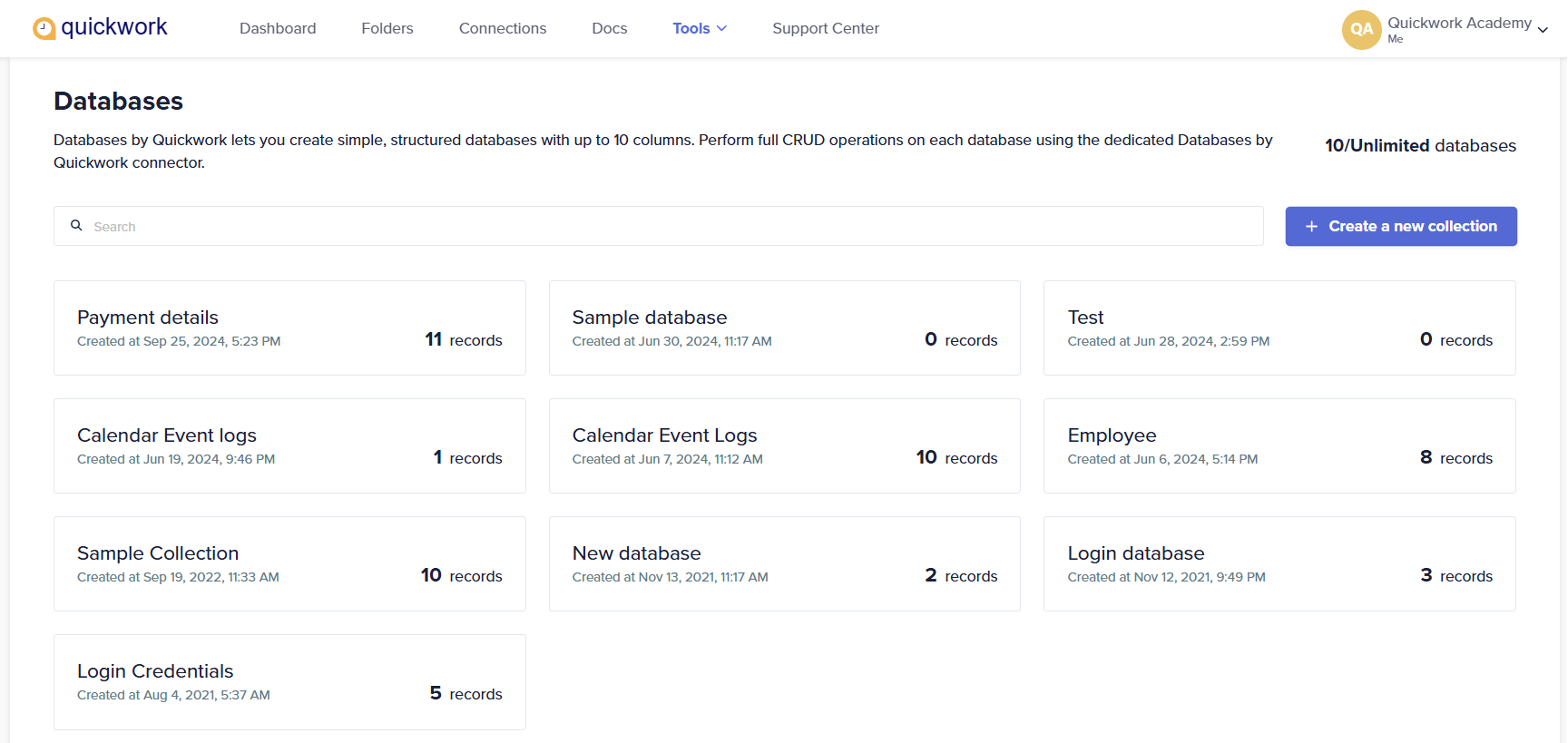 This section explains the Databases tool, which enables you to efficiently perform create, read, update, and delete (CRUD) operations on your collections (or tables) using the Quickwork platform.