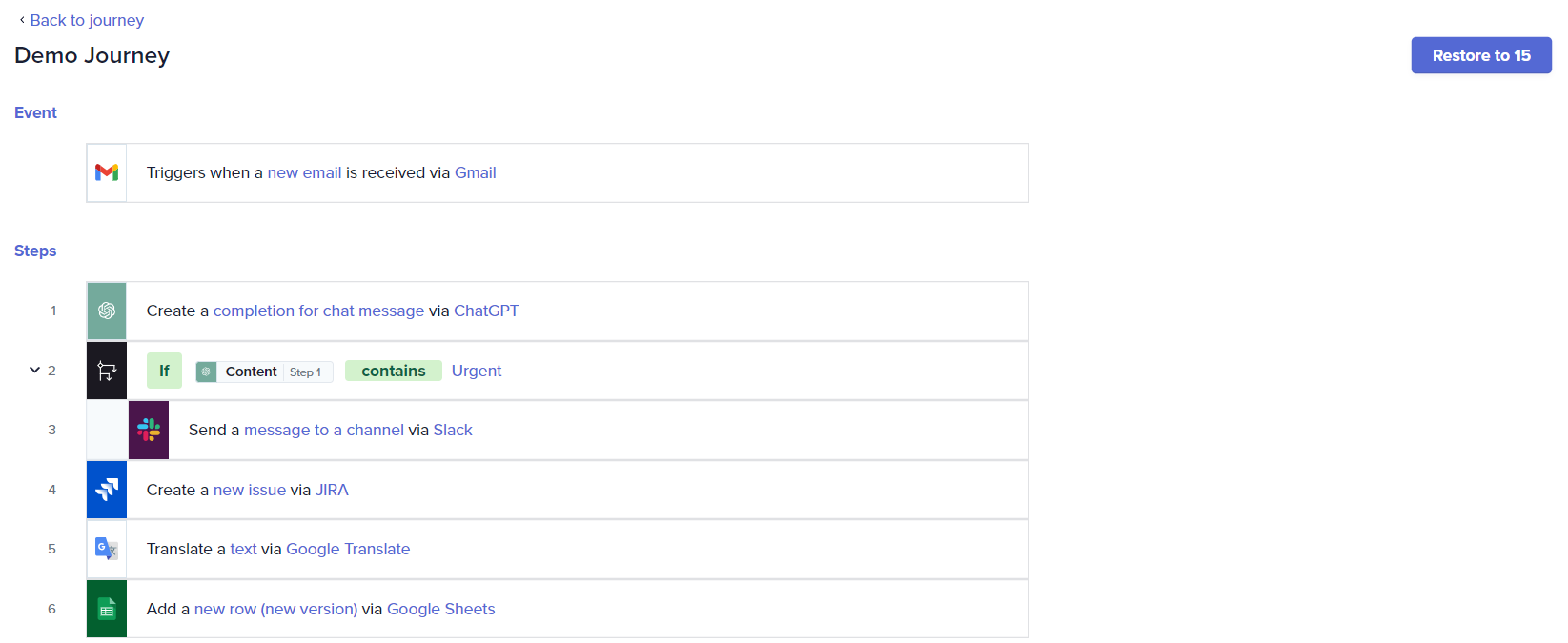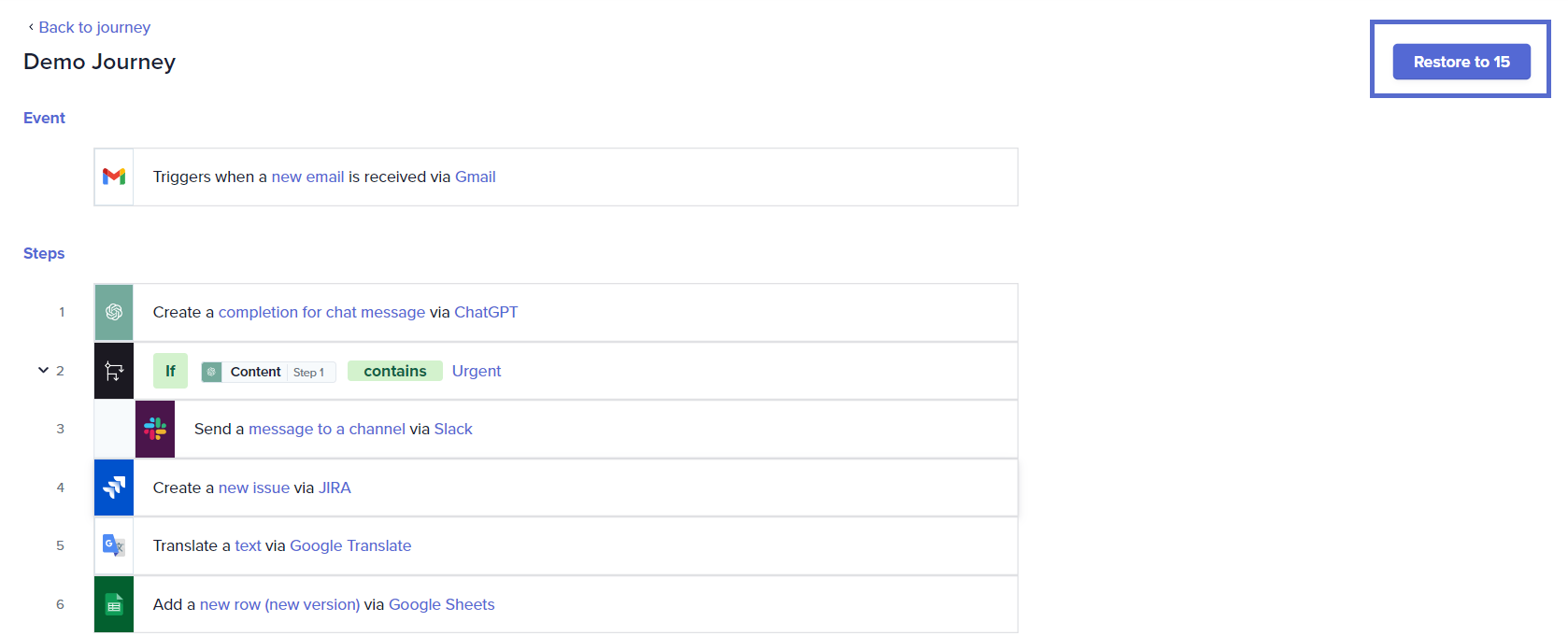 If you decide not to restore the journey and wish to exit version restoration, click the Back to journey link located at the top-left corner.