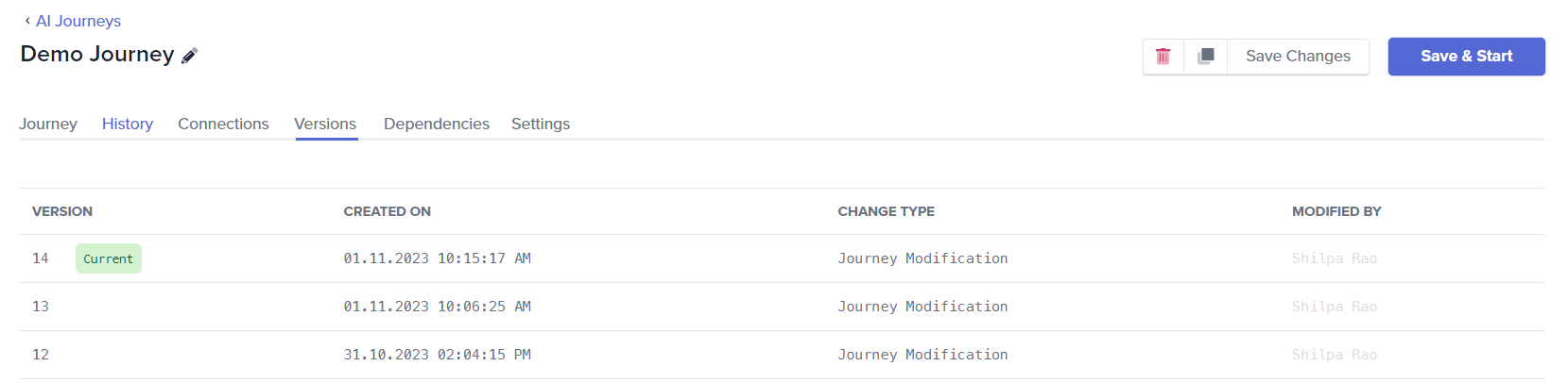 Each modification saved in a journey is assigned a unique version ID. The Versions tab maintains a log of all version entries for a journey, including the version number, date and time of changes, the name of the modifier, and the label Current for the current version.